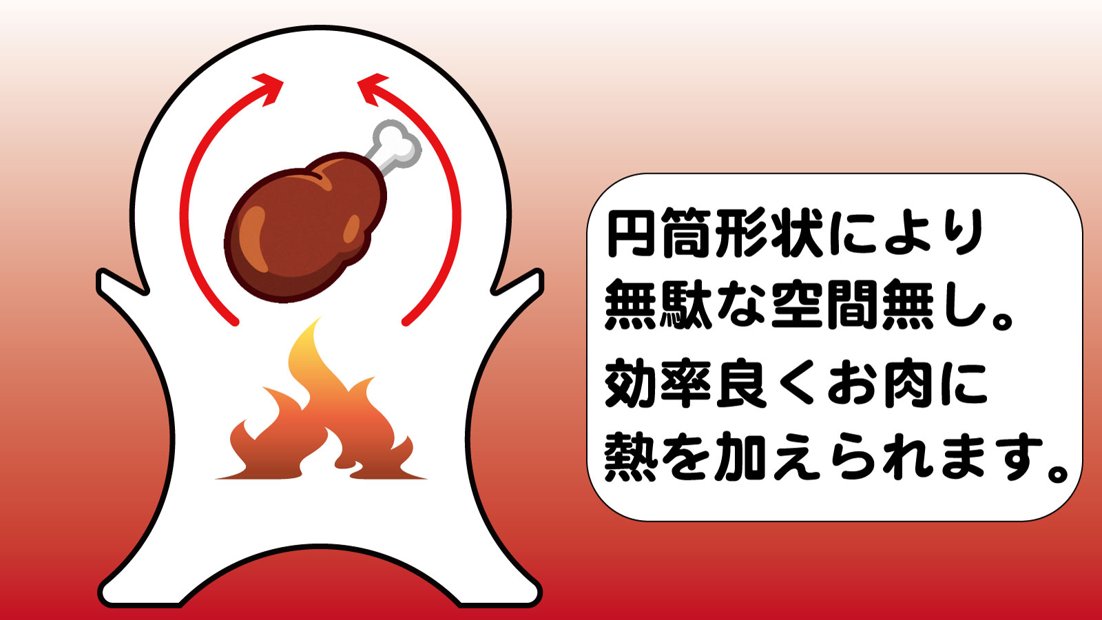 回転する丸鶏との間に無駄な空間を作らない対流と空間を考えた円筒デザイン。