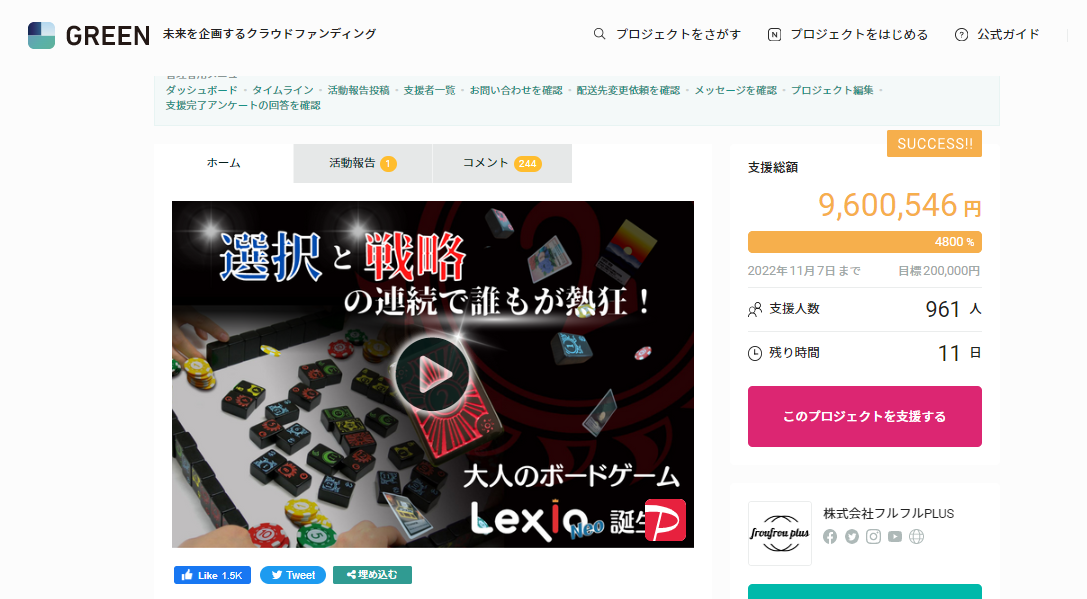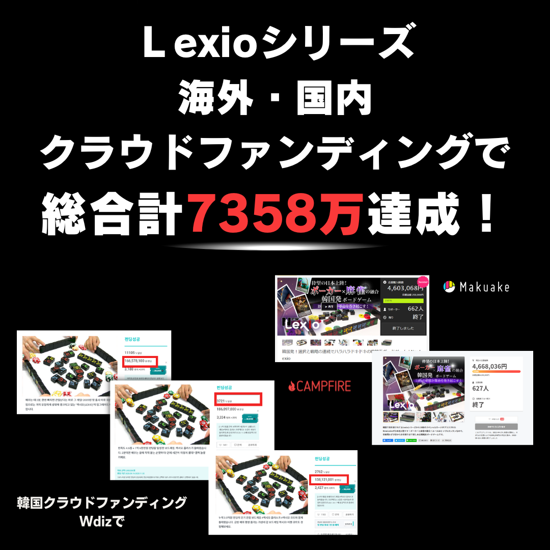 韓国の大手クラウドファンディングサイトWadizで約6431万円の支援を受け、Wadizボードゲームジャンルでは歴代1位を獲得し「Wadizアワード2020」を受賞しています。そして日本では前作NewLexioで927万円、国内外合わせて合計7358万円の支援を達成しています。