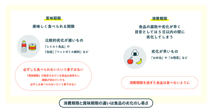 あまり知られていませんが「賞味期限」が設定されている商品には「消費期限」は設定されてません。