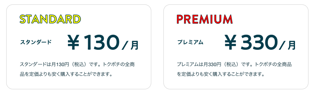 トクポチで商品を購入するには「スタンダード」と「プレミアム」2つのプランのどちらかに加入する必要があります。商品は、サイトに掲載されてから を重ねるごとに一定の割引率で割引されていきます。割引率は以下の通り、プランによって変わってきます。