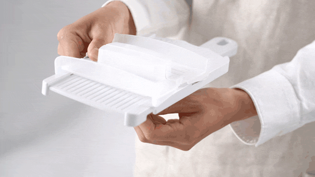ホルダーの裏側はトゲではなく筋状の滑り止めを付けました。最後まで食材を傷付けず、無駄なくスライスできます。