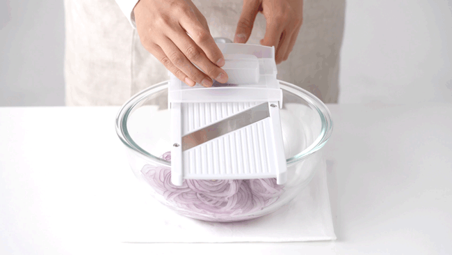 - 使い方は簡単。溝をボウルに引っ掛けて安定させ、スライサーの上に食材を乗せてスライスさせるだけ。