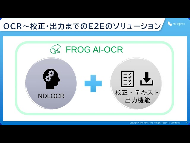 モルフォAISは、2022年7月1日より地方図書館・自治体様からのデジタル田園都市構想を背景としたデジタルアーカイブ事業や読書バリアフリー法対応のニーズを受け、国立国会図書館がオープンソース(CC BY4.0)で提供するNDLOCR(注3)を活用した市販ソフト「FROG AI-OCR」の提供を開始いたしました。