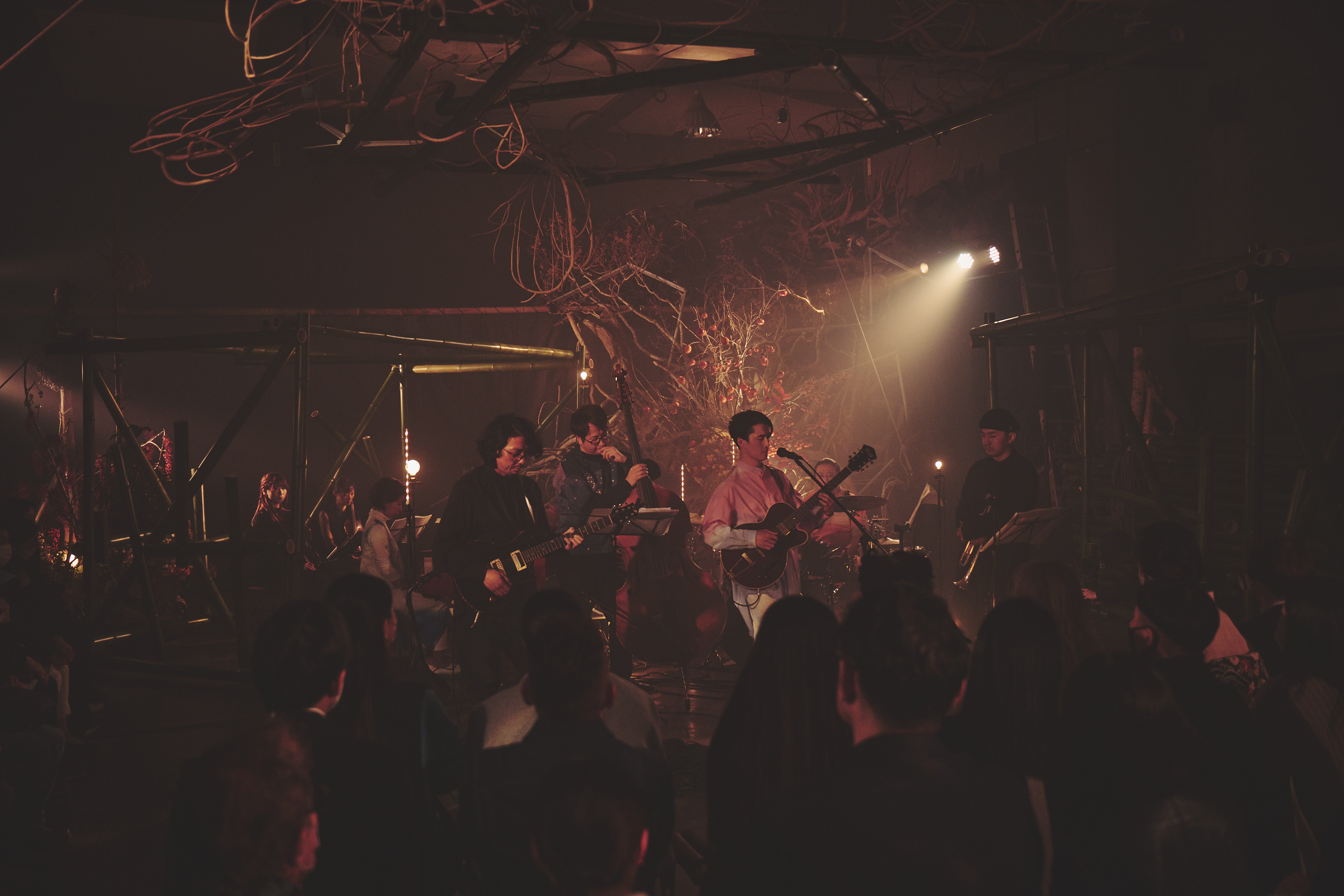 公演前半は平原慎士が率いる総勢10名のミュージシャンによる演奏。「水を編む人々」「げに百鬼夜行一幅の活図なり」「Drunk Tank Funk」などオリジナル曲を含む7曲を披露しました。バリエーションに富んだ楽曲と演奏の迫力で会場は拍手喝采に。そして、前半最後の曲「Warm」に続くかたちで会場が暗転し、ギターの歪んだ音色に包まれた暗闇にバーライトを持った座・草月が入場して公演後半が開始。会場に設置されていた竹の枠組みが演奏者を囲み始めると、約30分をかけて「(R)equiem」の演奏に合わせたいけばなが行われました。終盤にはミュージシャン達の姿が見えなくなる程の作品に仕上がり、音楽と共に雰囲気は最高潮へ。「音楽で花を手向ける」というテーマを体現するかのように、いけばなに覆われたステージでアンコール曲を演奏し、拍手喝采の内に終演しました。公演翌日には完成したいけばなの作品と楽器を公開し、公演の収録音源を会場に流して展示会を開催しました。