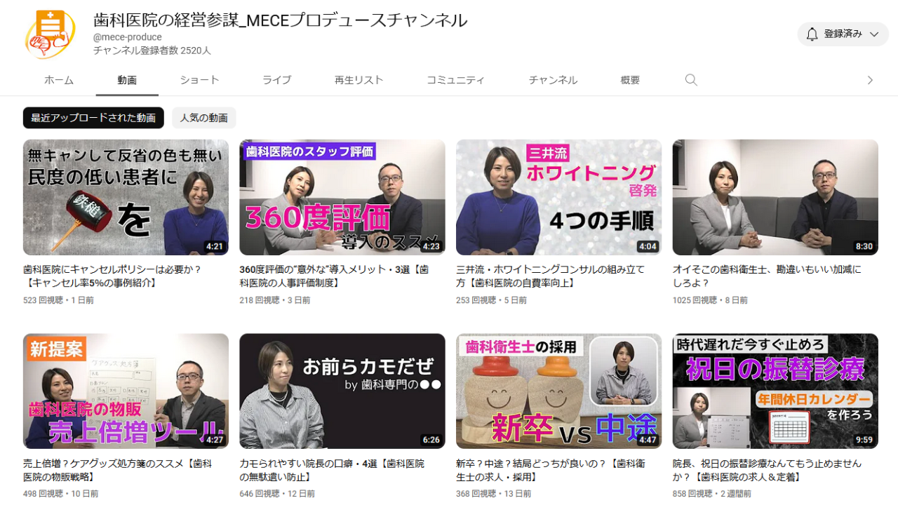 同社は歯科医院の経営に役立つ情報を日々、公式YouTubeチャンネルで提供しています。「歯科医院の経営参謀・MECEプロデュースチャンネル」はチャンネル登録者数が2,500名を超え(2022年12月現在)、歯科関係者を中心に日々の医院経営に役立てられています。