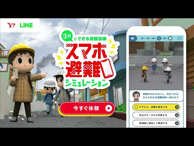 ユーザーはシミュレーションを通じて、“地震発生時の初期行動”や“デマや誤情報への対応”、“避難場所の確認・移動”、“「LINE」での安否確認”などをアニメーションとともに、クイズに回答しながら学べます。