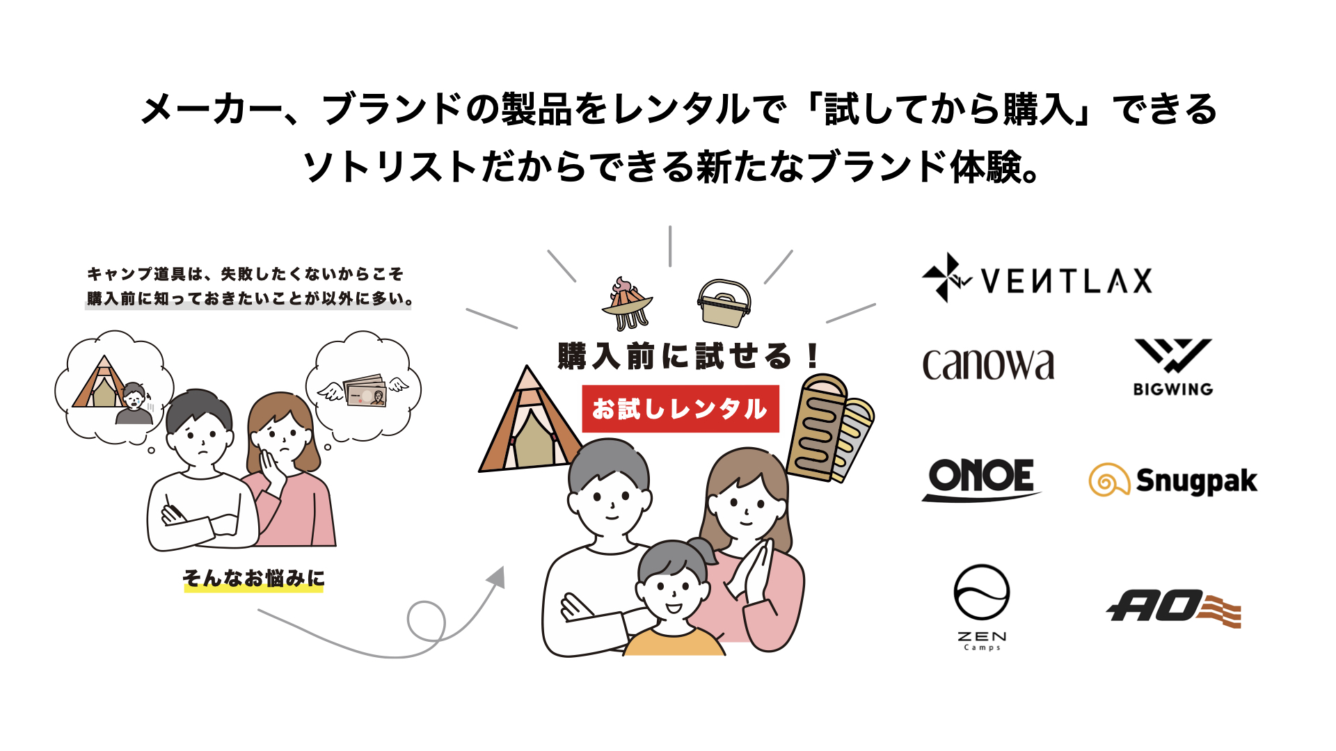 「ソトリスト」は、これまでなかったキャンプ用品のシェアリングに着目し、購入前の試用や前日予約も可能なサービスの提供を行う。 また、購入後の使用回数がわからないまま高価になってしまいがちのキャンプへの初期投資費用を格段に抑えられるとと、使用後の面倒な清掃を当社が請け負うことから、キャンプ未経験者でも気軽にキャン プを始められます。また、キャンプ用品を預けるオーナー側は、遊休化している用品を無償 で保管してもらえることに加え、預けた用品がレンタルされた際には、一定額を報酬として受け取れます。