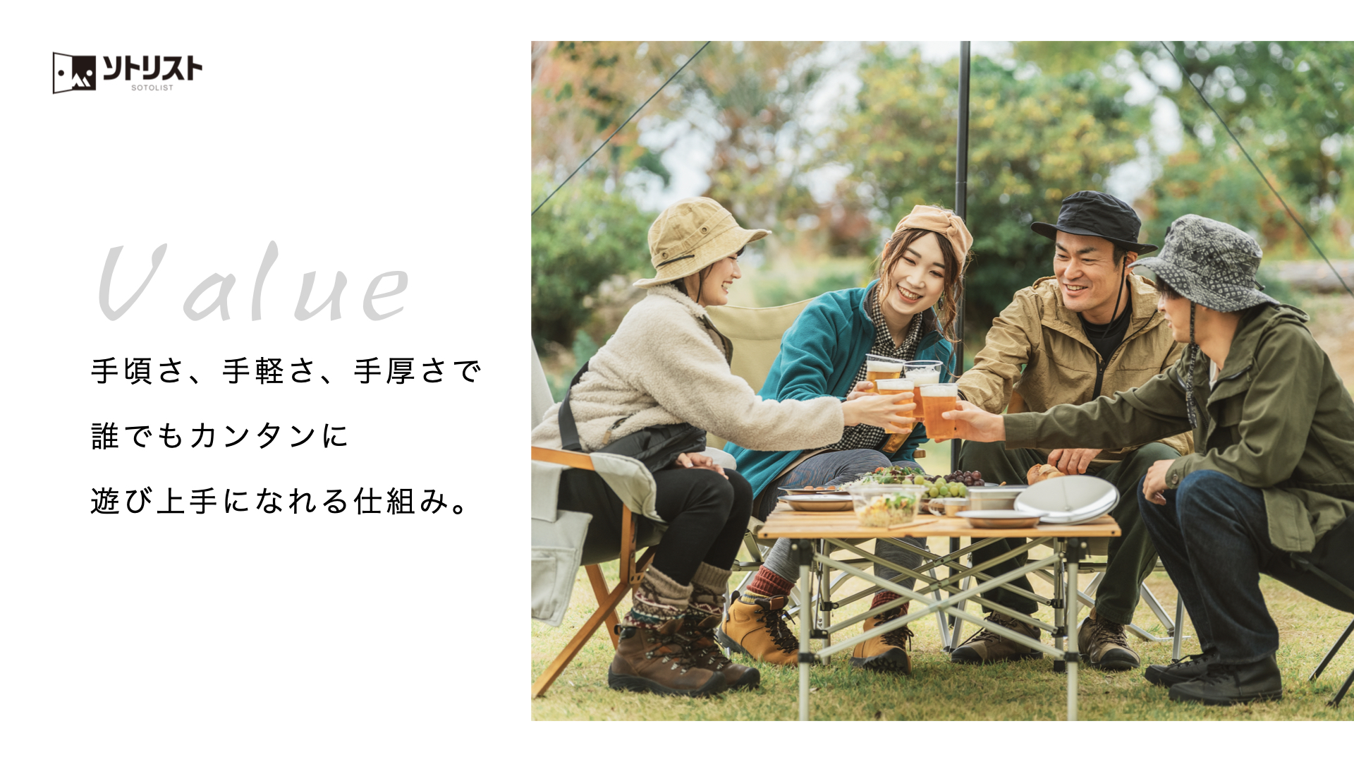 当社は、「誰でも遊び上手になれる仕組みで社会を豊かにする。」をミッションに、アウトドアならではのハードルや課題を、手頃さ、手軽さ、手厚さの3つの仕組みで解決する、キャンプ用品のシェアリングおよびキャンプ場予約をワンストップで実現できる WEB サービス「ソトリスト」 を2020年11月より展開。