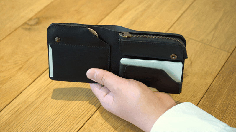 財布を開くとカード収納部がカードの重みでせり出してきて、カードをとり出すことが可能。複数枚の一番前と一番後ろは瞬時に出し入れできます。