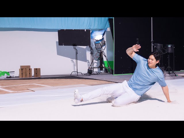 水色Tシャツに白パンツを身に纏った爽やかな雰囲気でスタジオ入りした大谷選手。バットを手にしてホームラン予告のパフォーマンスや、バットでスパイクの土を落とす仕草など、さすがの慣れた手つきでスムーズに撮影が進みました。セット転換の合間には、軽く素振りをしたり、スタッフと談笑したりリラックスした様子。収録終盤に行われたスライディングシーンの撮影では、シーズンさながらの華麗なスライディングを披露し1発OK。現場には拍手が沸き起こりました。