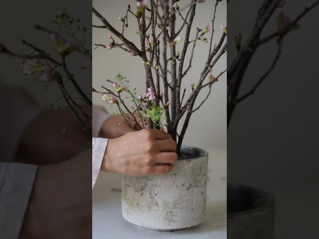 桜を自由にスポンジに挿します。桜の根元は水あげしやすようにカットしてあります。長さを調整したい場合は枝の根元を斜めに切ります。