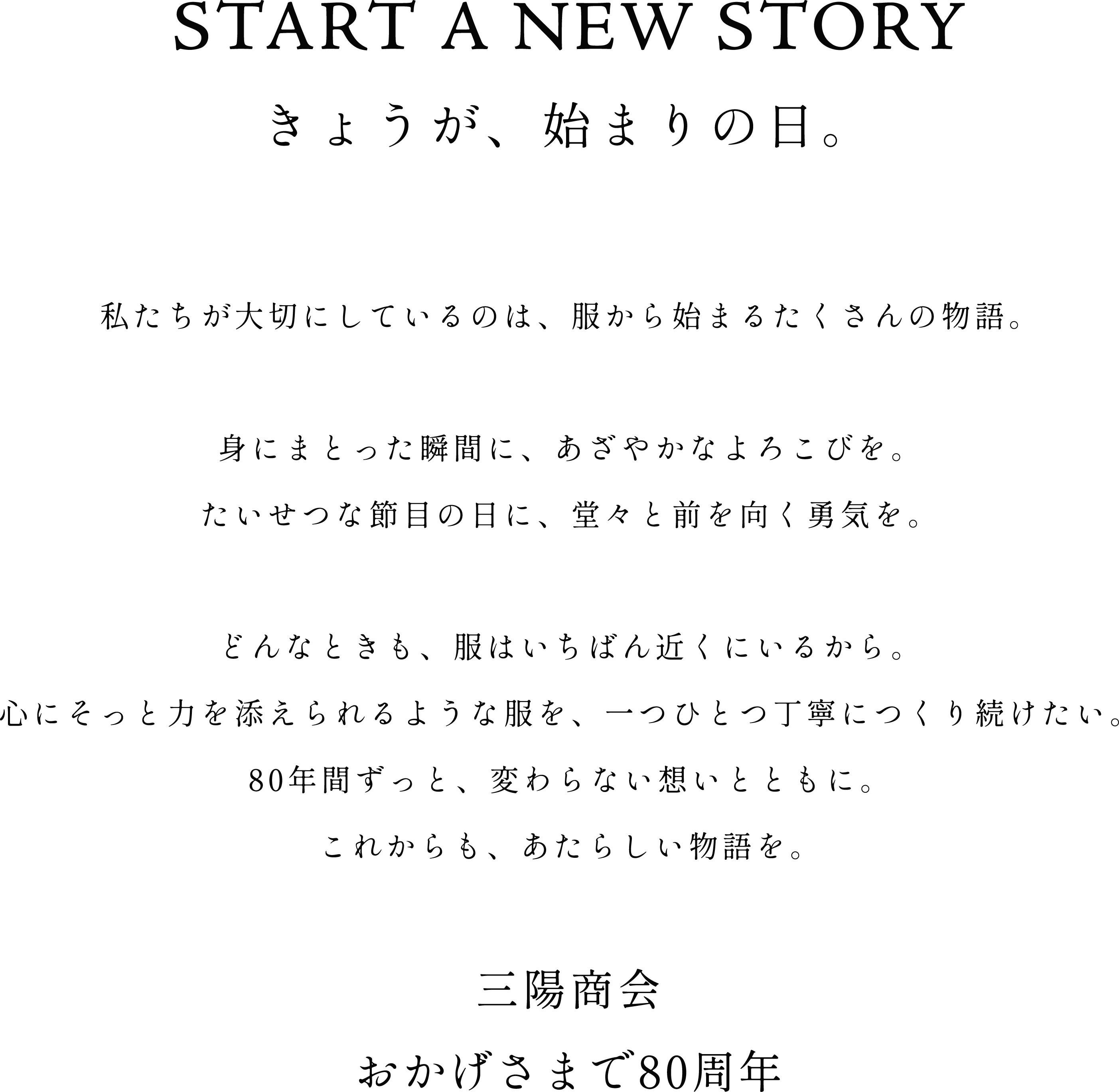 三陽商会80周年記念ロゴは、この先もずっと変わらず丁寧に服をつくり続けていきたいという想いを、紡がれていく「糸」をモチーフにデザイン。お客さまとのつながりを大切にしながら、あたらしい物語を紡いでいくという意志と決意を、始まりをイメージしたあざやかなカラーで表現しています。