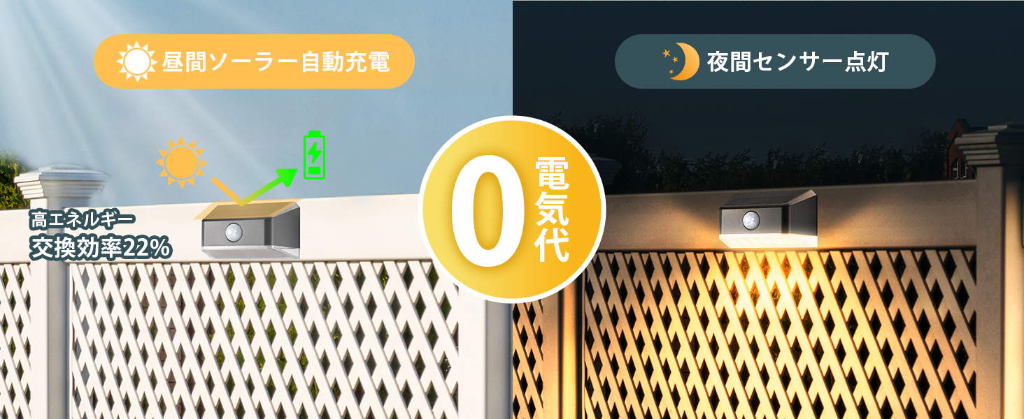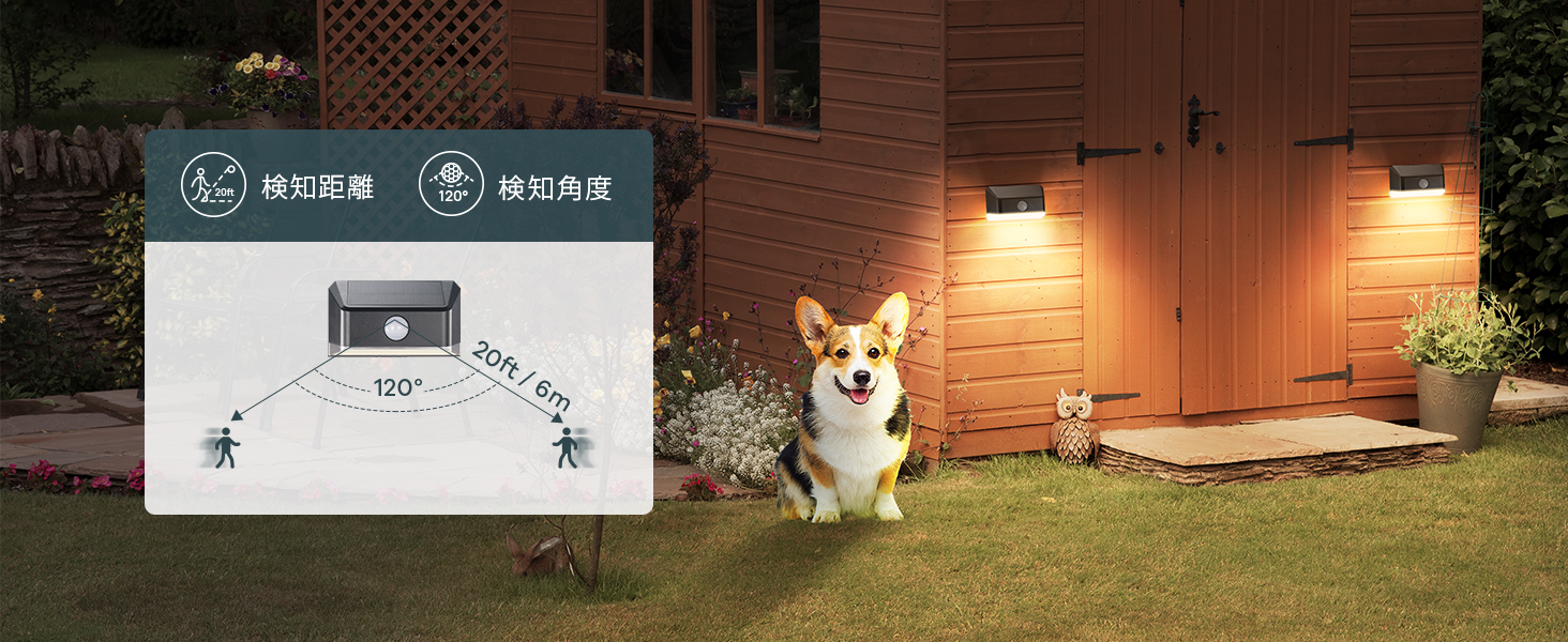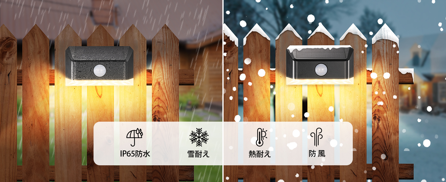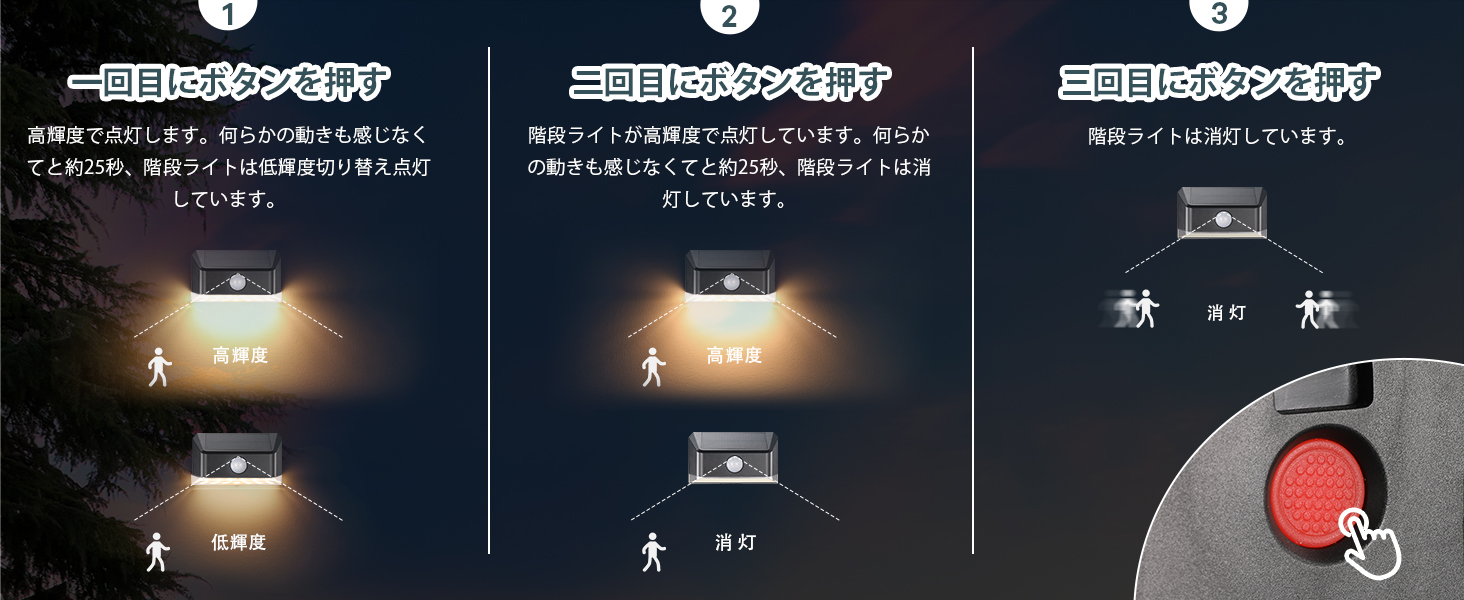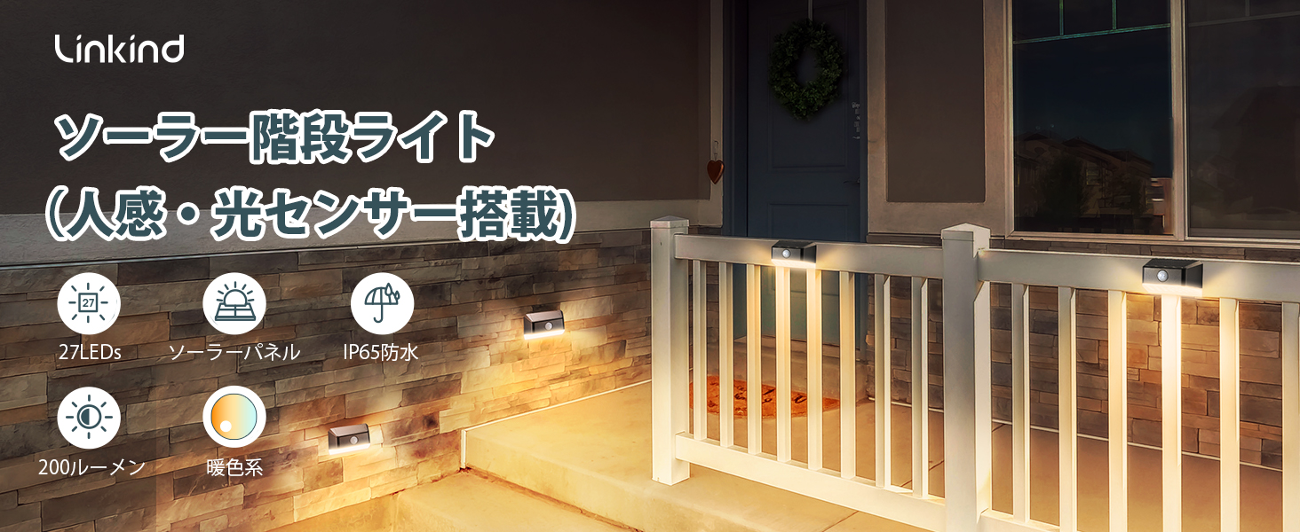 【人感・光センサー搭載】光センサーが搭載され、夜間になれば自動的に電源がオンになり、朝になると自動的にオフになります。感応範囲は6m、120°です。また、人感センサーも搭載され、人や車の動きを感知するとソーラーライトは高輝度で点灯する。何か動きが感応しなければ、25秒後、階段ライトは消灯しています。