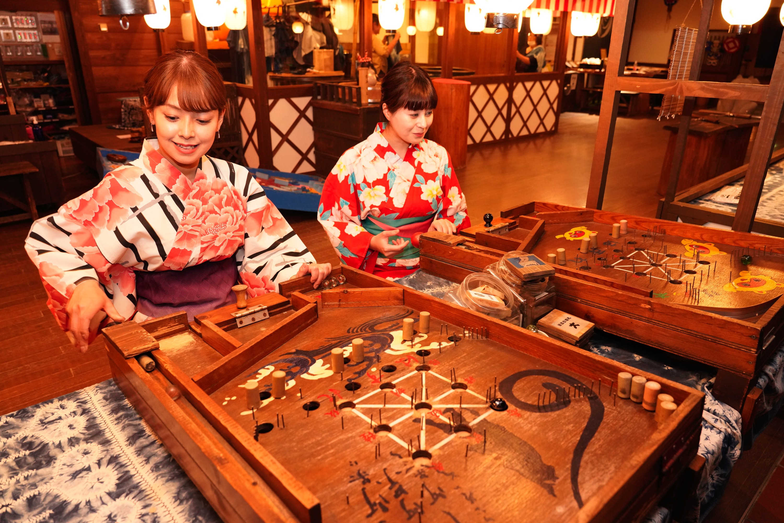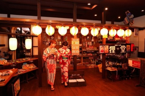 SNS 投稿で、館内のレトロモダンな「阿波の國」駄菓子屋さん狸堂や縁日遊びで使える
