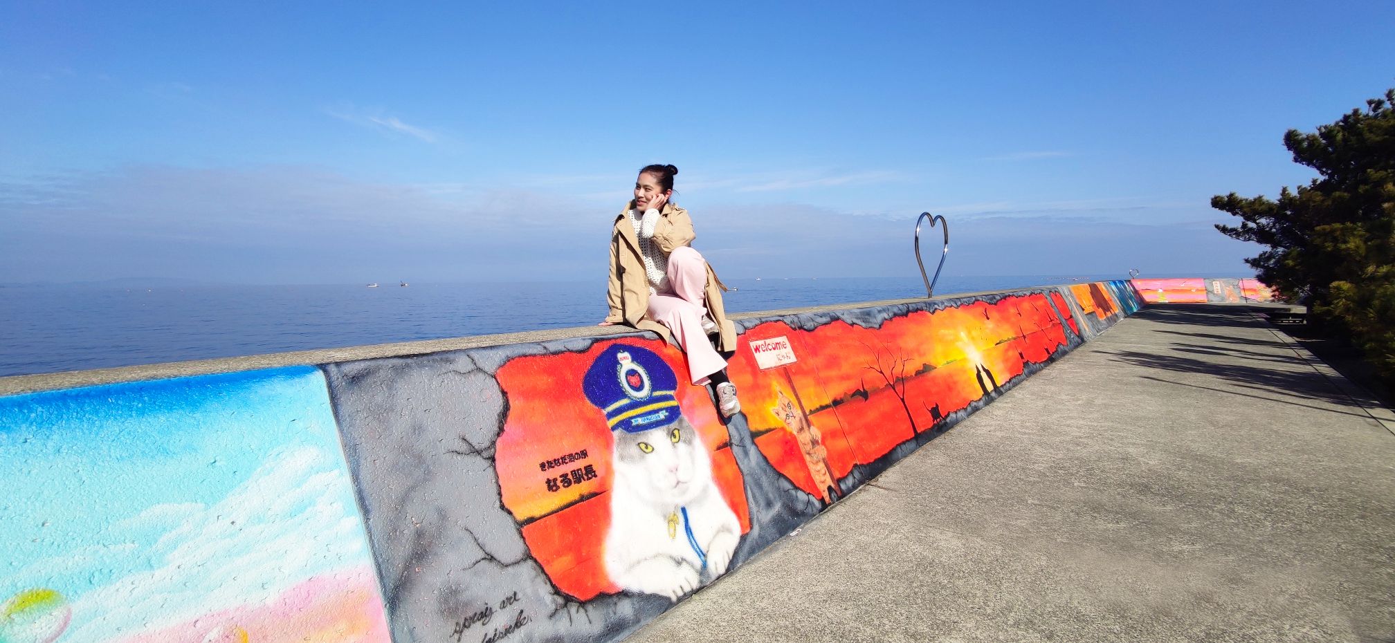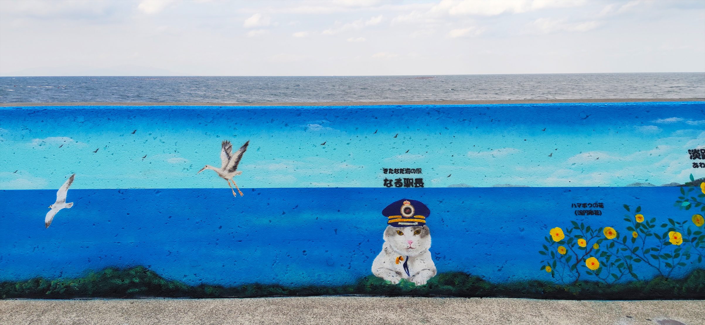 また、車で20分の鳴門市「きたなだ海の駅 ウォールアート」は看板猫 ”なる駅長” がほっこり防波堤スプレーアートでお出迎え。美しい播磨灘を 背景に SNS 映え間違いなしの作品の数々が 2022.11 新登場。