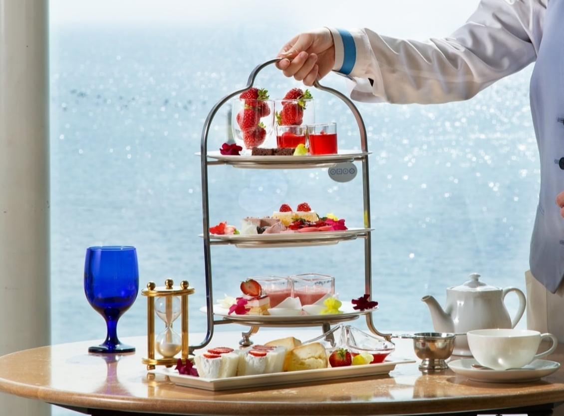 窓一面に広がる煌めく海を眺めながら、ゆったり寛げる絶景カフェ。