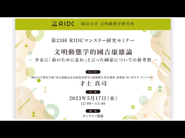 今回、2023年5月17日(水)にオンライン開催した第23回RIDCマンスリー研究セミナー「文明動態学的國吉康雄論 〜少女に「命のために走れ」と言った画家についての新考察」(スピーカー: 岡山大学教育学域 国吉康雄記念美術教育研究と地域創生寄付講座 准教授、 同 5Dラボ ディレクター 才士真司)の録画配信を5月18日に開始しました。ぜひ皆様にご視聴頂けますと幸いです。