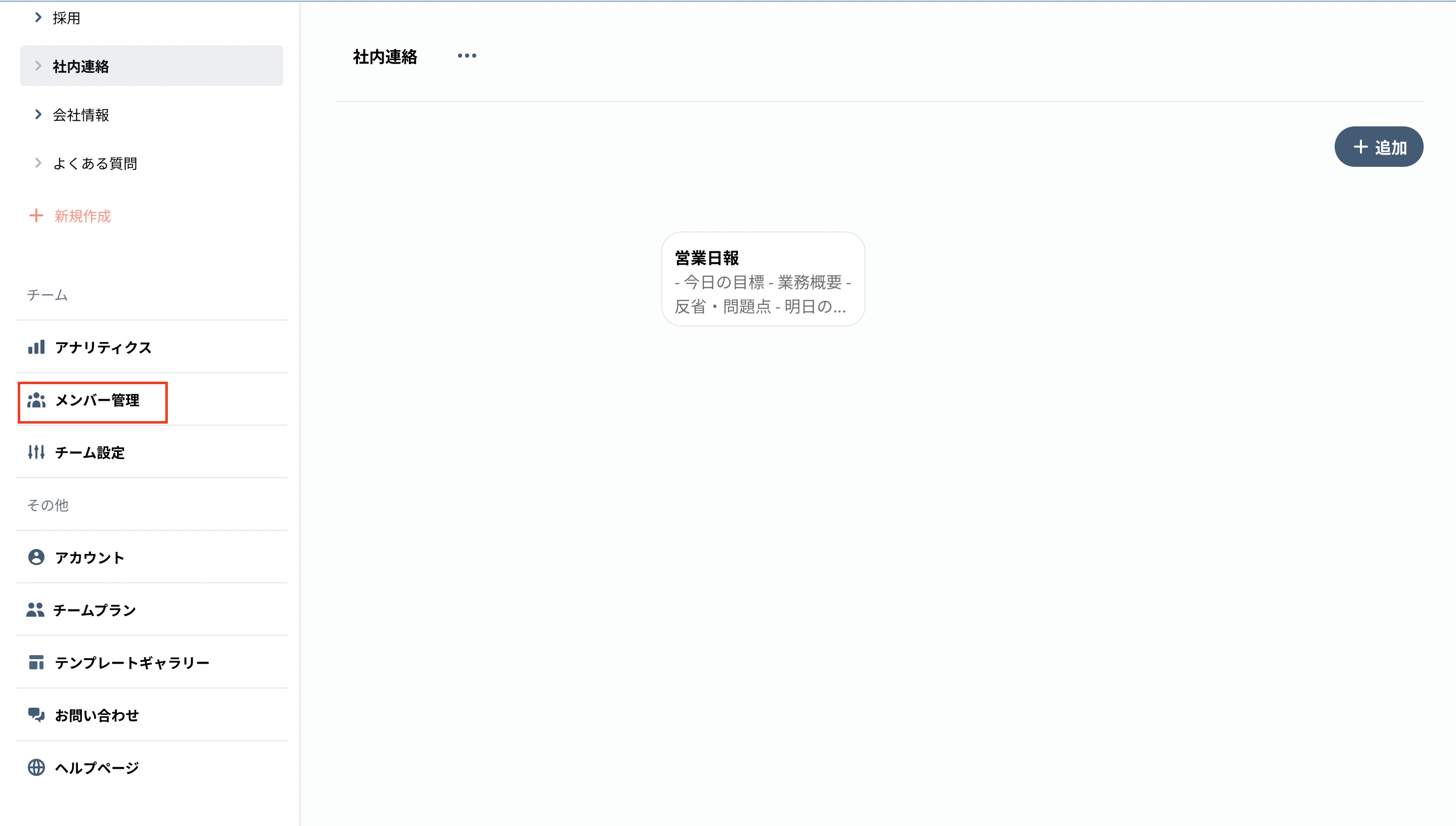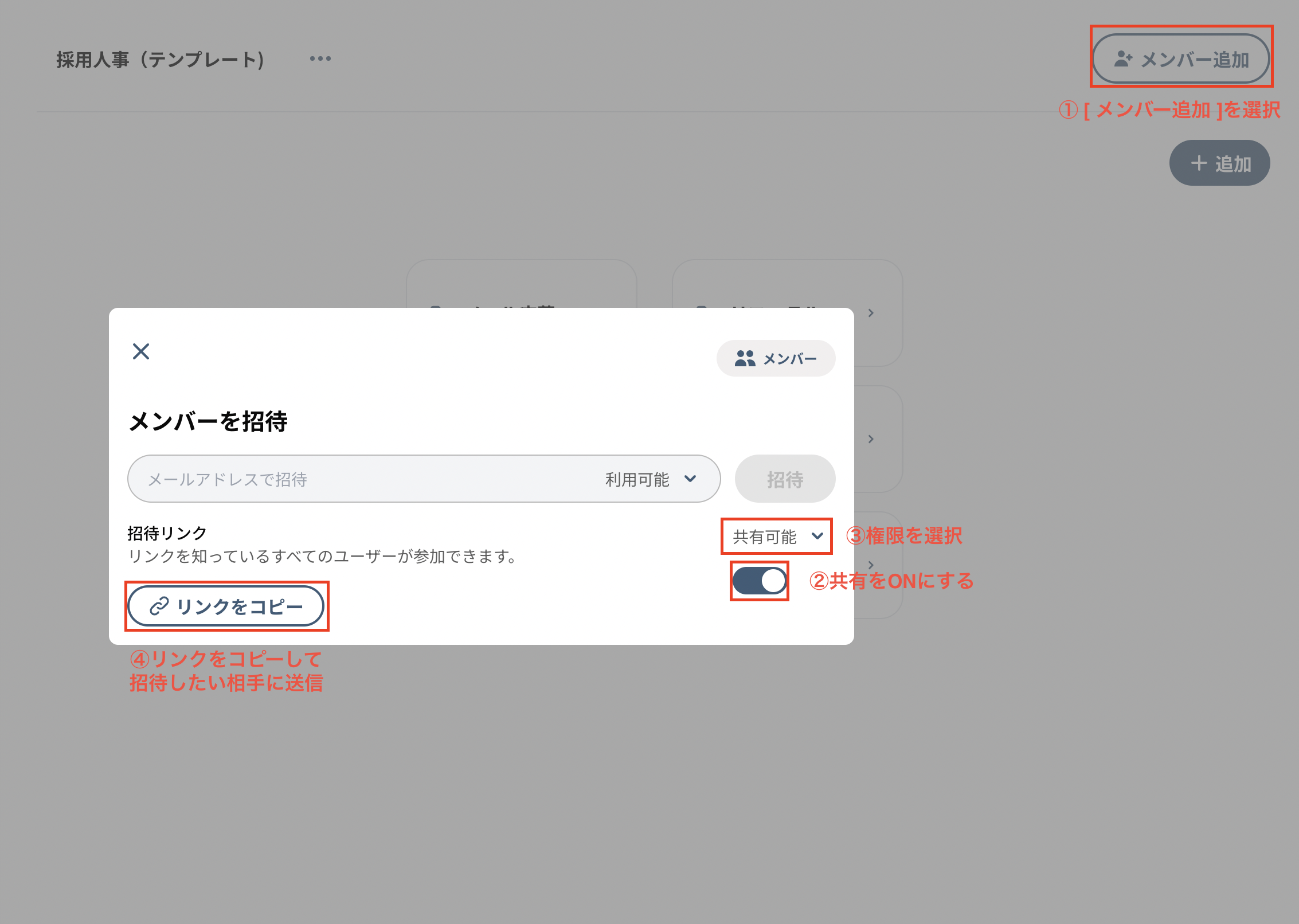 チームのメンバー管理画面から、メンバー追加を行い、上記参考画像と同様に招待ができます。