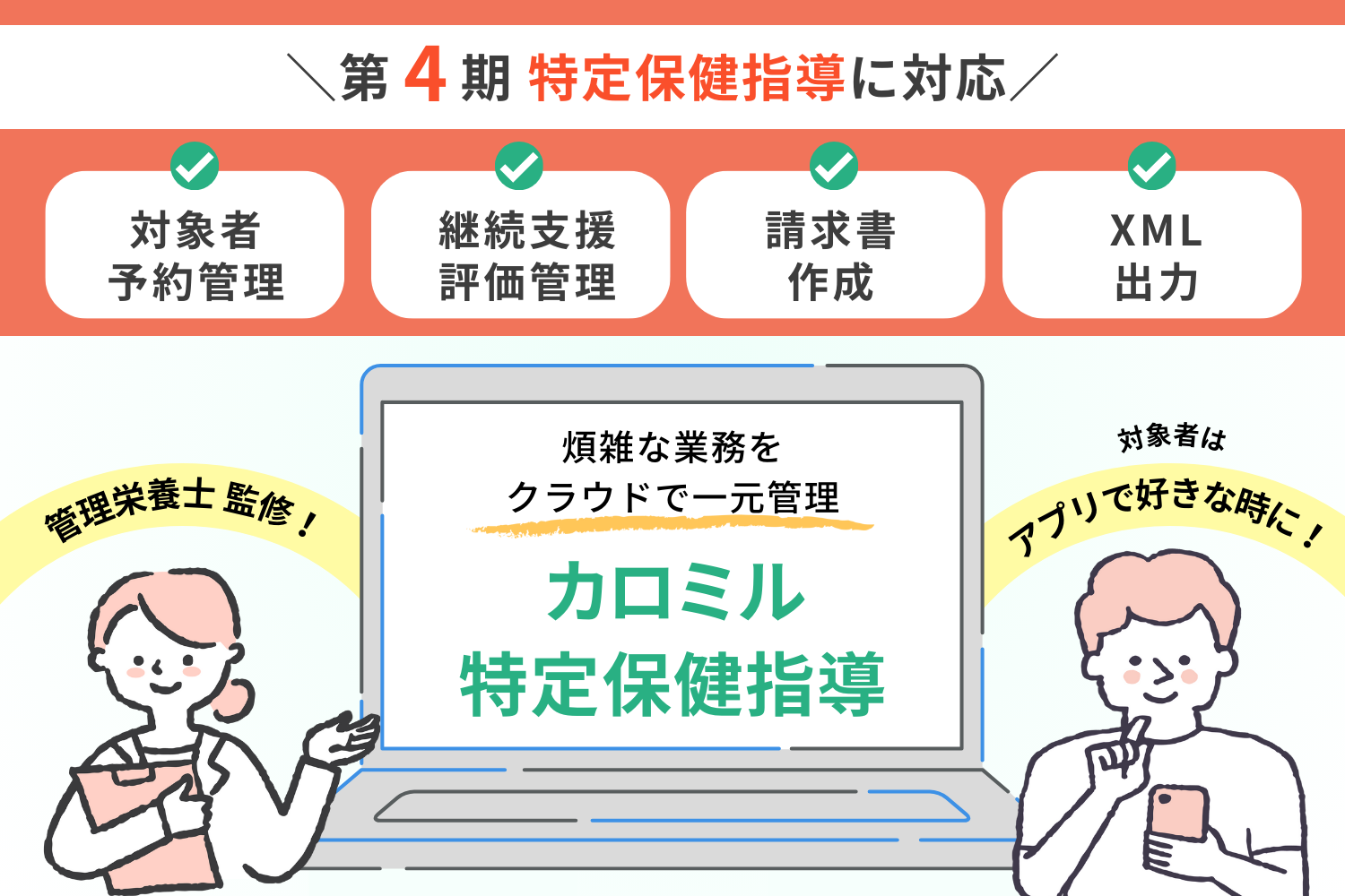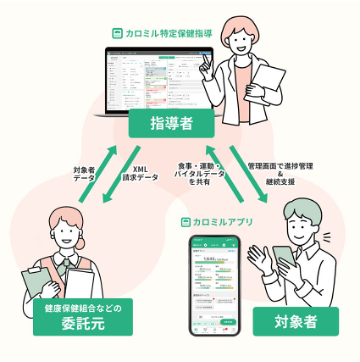 指導者は「カロミル特定保健指導」を使用することで「対象者管理〜指導管理〜法定報告用データ作成」を一つ のツールで完結でき、指導対象者は食事・運動・体重管理アプリケー ション「カロミル」を使用することで簡単にバイタルデータや食事の 記録ができるほか、アプリ上で継続支援を受けることができます。