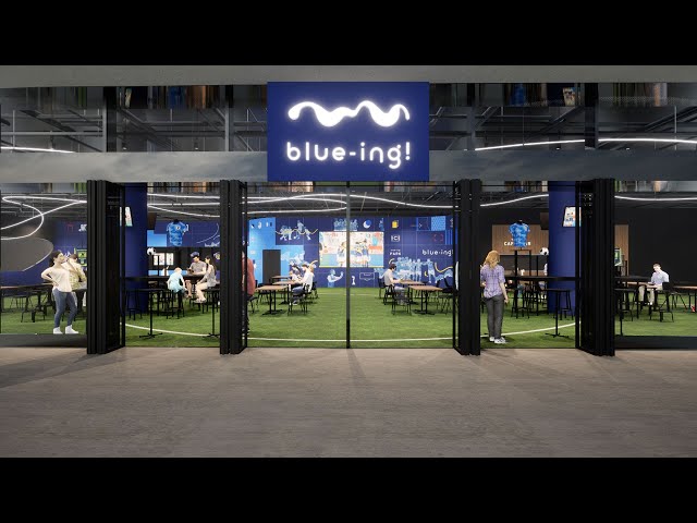 この度公開する3Dフロアマップとイメージ画像では、記念品の展示、カフェ&バー、サッカーショップが並ぶ「PARKエリア」と、生成AIなど最先端のデジタル体験ができる「DISCOVERYエリア」の二つのエリアの様子を見ることができます。フロアマップでは「PARKエリア」を3Dムービーで再現。サッカーのピッチを模した人工芝生のフロアや、“青(blue)”をテーマカラーとしたサッカーのモチーフ、迫力の瞬間を切り取った壁面ビジュアル、大型ビジョンに映し出される日本代表戦など、さまざまな疑似体験を楽しむことができます。また、blue-ing!独自のメニューを堪能できるカフェ&バーのほか、オリジナルグッズや日本代表のグッズなどを販売するサッカーショップもご覧いただけます。