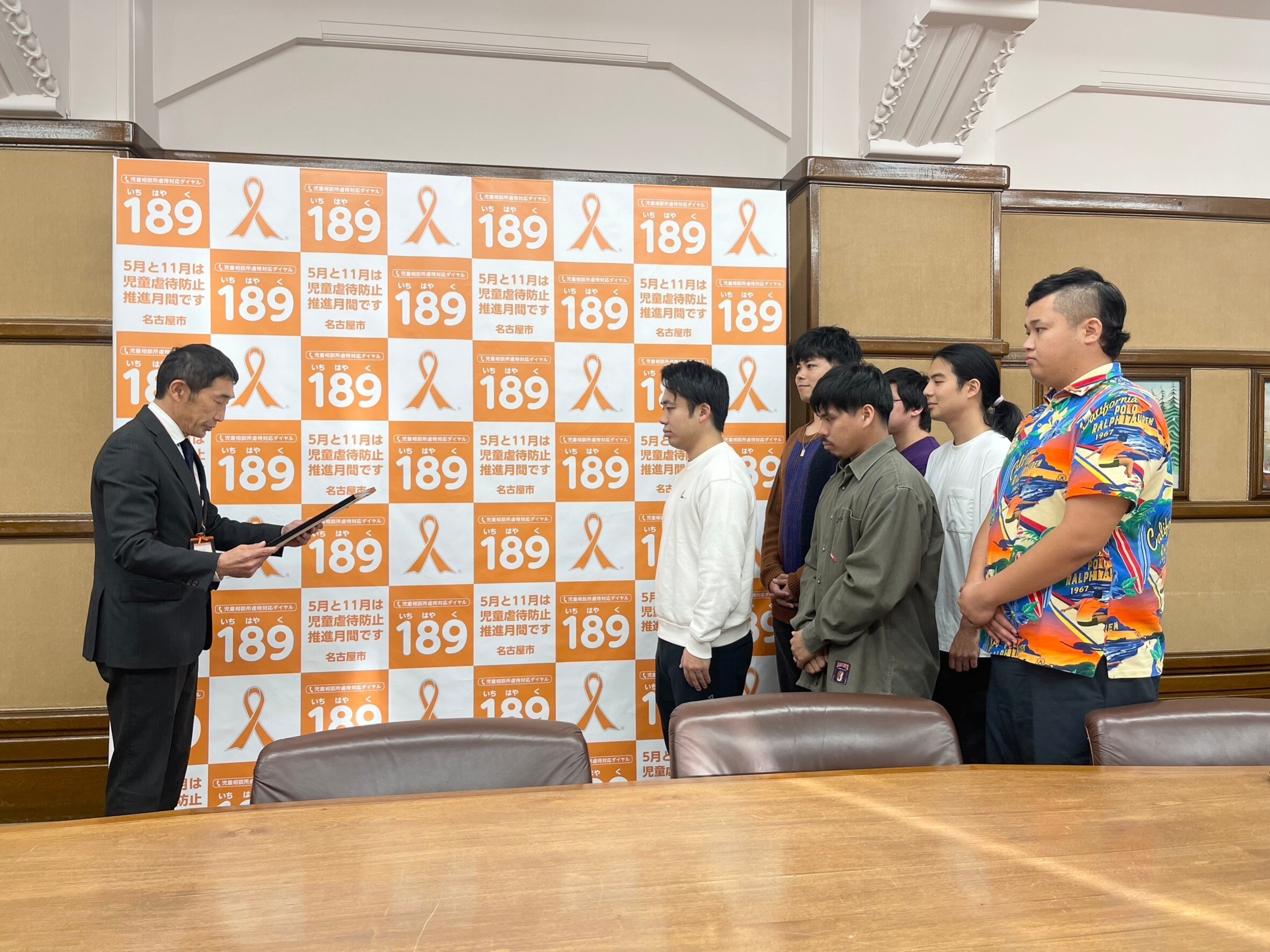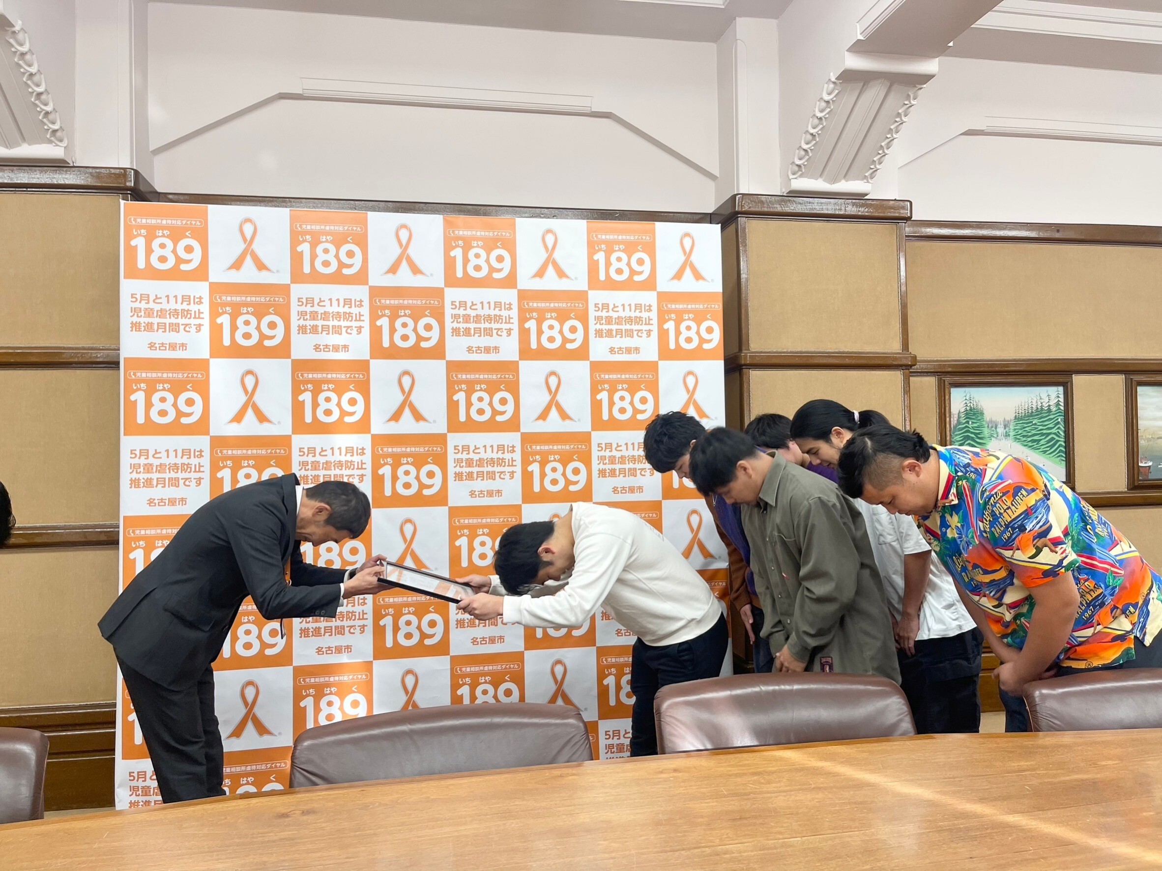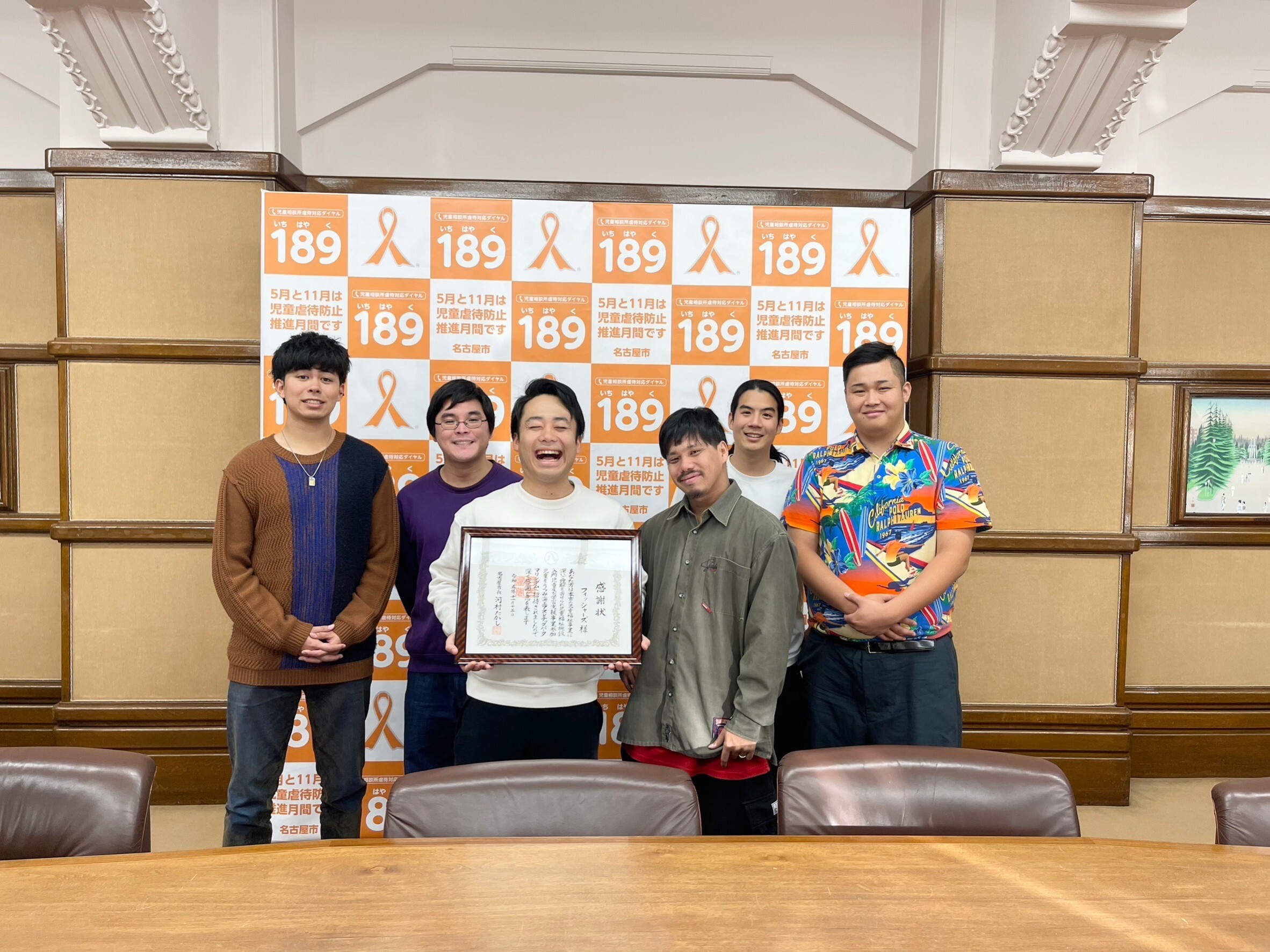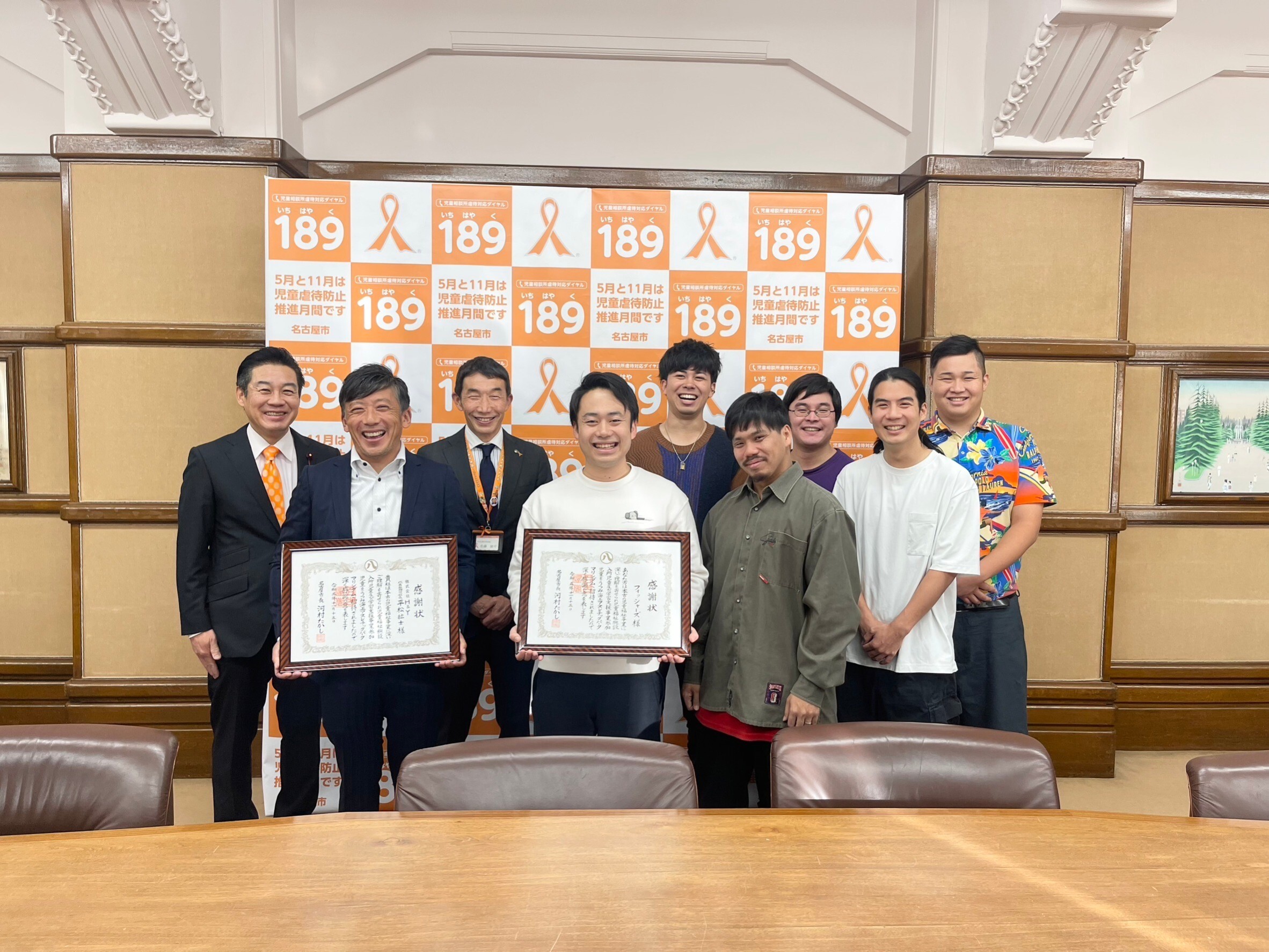 名古屋市役所の本庁舎にフィッシャーズメンバーをご招待いただき、うつみ海上アスレチックパークマリンダムの運営会社である株式会社H&Y様と共に、感謝状を贈呈いただきました。