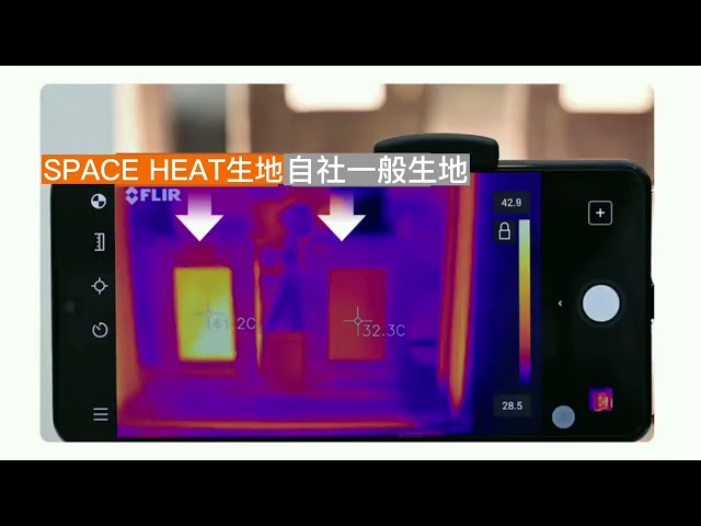 SPACE HEAT生地と一般的な生地を29℃室内環境下で、ハロゲンランプで加熱する実験を行なっています。加熱開始してから約1分後、SPACE HEAT生地が有効的に熱を吸収し、表面温度をキープしていることが確認できます。
