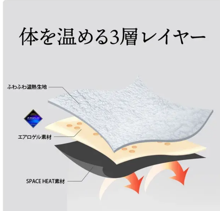 冬に冷えやすいひざ部分に、体を温める特殊な3層構造を採用しています。表層には触り心地がふわふわの温熱生地をたっぷりと、中層にエアロゲル素材をに使用。そして肌に触れる部分には、温度を吸収蓄熱するSPACE HEAT素材が入っており、着心地を損なうことなく暖かさが持続します。これによって、究極の暖かさを実現しました。