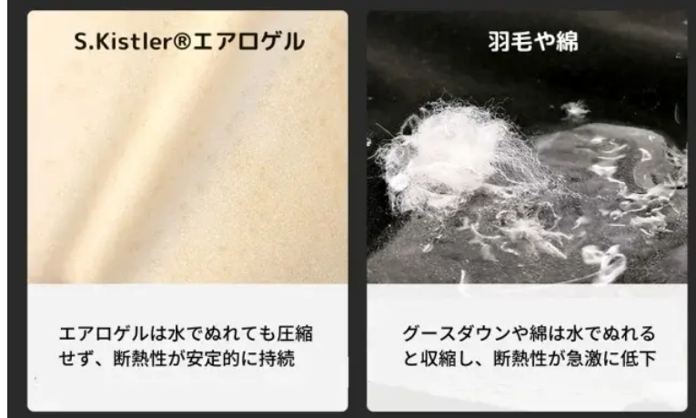 S.KISTLER®エアロゲルは非常に軽く、安定した構造を持っています。水に濡れても、乾いた後は元の形に復元し、安定した保温性を発揮します。濡らして干してを繰り返し、100回洗濯した後も、まるで購入当初のような断熱性能を維持します!