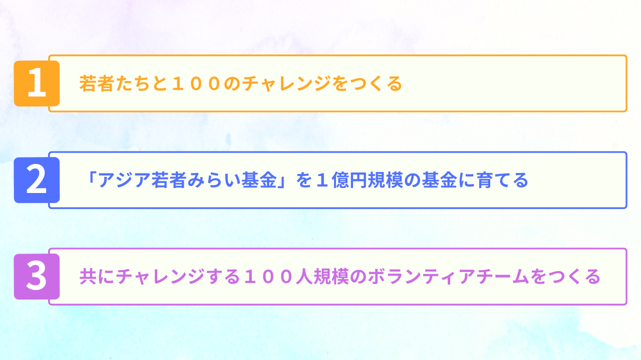 そのスタートにあたり、2024年の活動のために200万円を目標として、「若者チャレンジ100募金―アジアの若者たちと共にチャレンジする社会へ―」と題し、多くの方々からのご寄付を募ります。