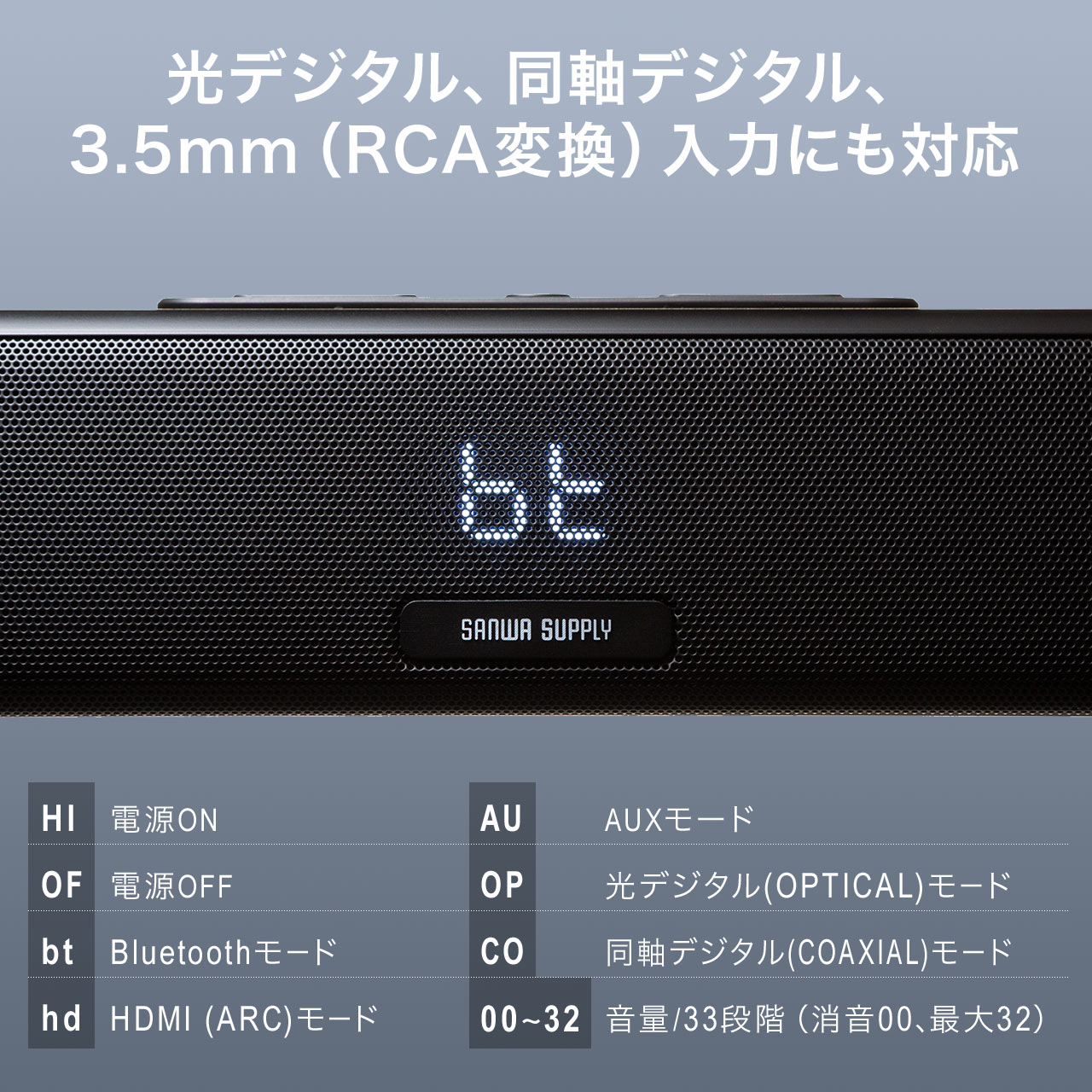 RCA-3.5mmステレオミニプラグ変換ケーブルが付属しています。ジャンルに合わせて選べる3つのサウンドモードを搭載しています。(BASS/3Dシアター/MUSICモード)前面のLED表示で、現在の接続状態の確認が可能です。