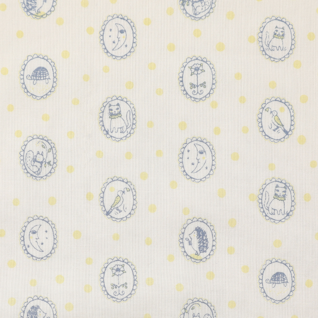 小鳥やハリネズミなどのモチーフがやわらかなタッチで描かれたテキスタイル。ビンテージ感のあるデザインをさりげない色使いで華やかに表現しました。