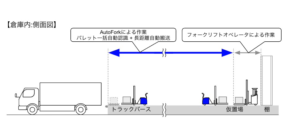 「AutoFork」は、従来の自動フォークリフトが実現できなかった、人がトラックバースや荷物の仮置場に置いたパレットを一括で自動認識・取得できる機能を備えており、倉庫内の仮置場とトラックバース間の効率的な自動搬送を可能とし、物流業界における課題を解決します。