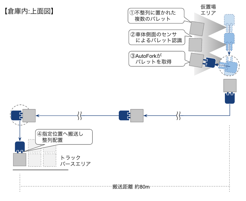株式会社ハクオウロボティクスが開発した、パレット一括自動認識・取得技術により、人が置いた複数のパレットを一括で認識して自動搬送します。「AutoFork」の車体側面に取り付けたセンサにより、走行しながら近くにあるパレットの位置を把握し、「AutoFork」がパレットへの進入角度と走行経路を生成し、パレット取得を行います。