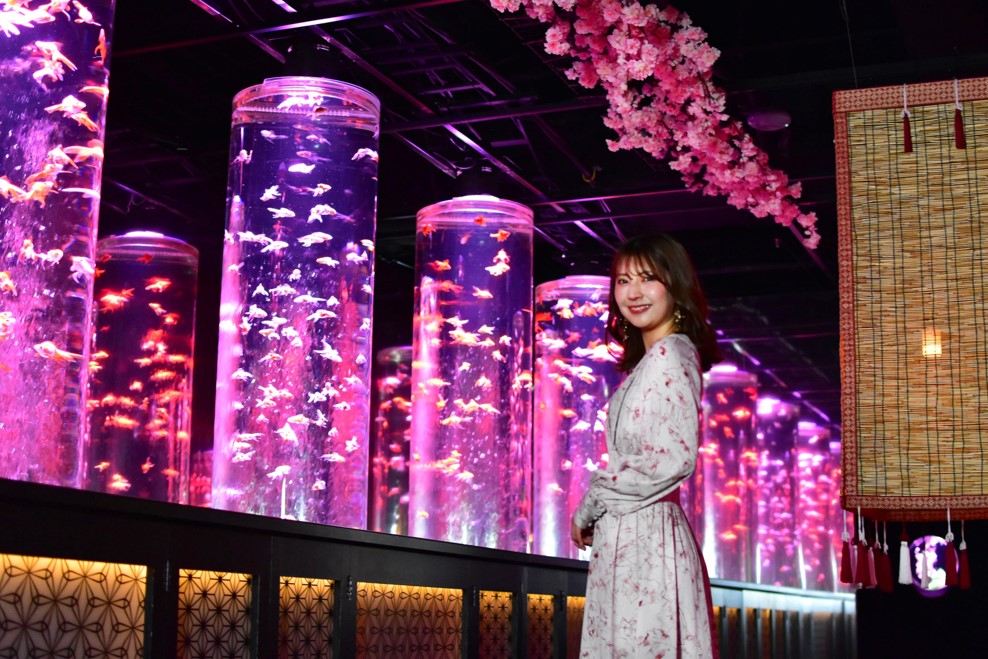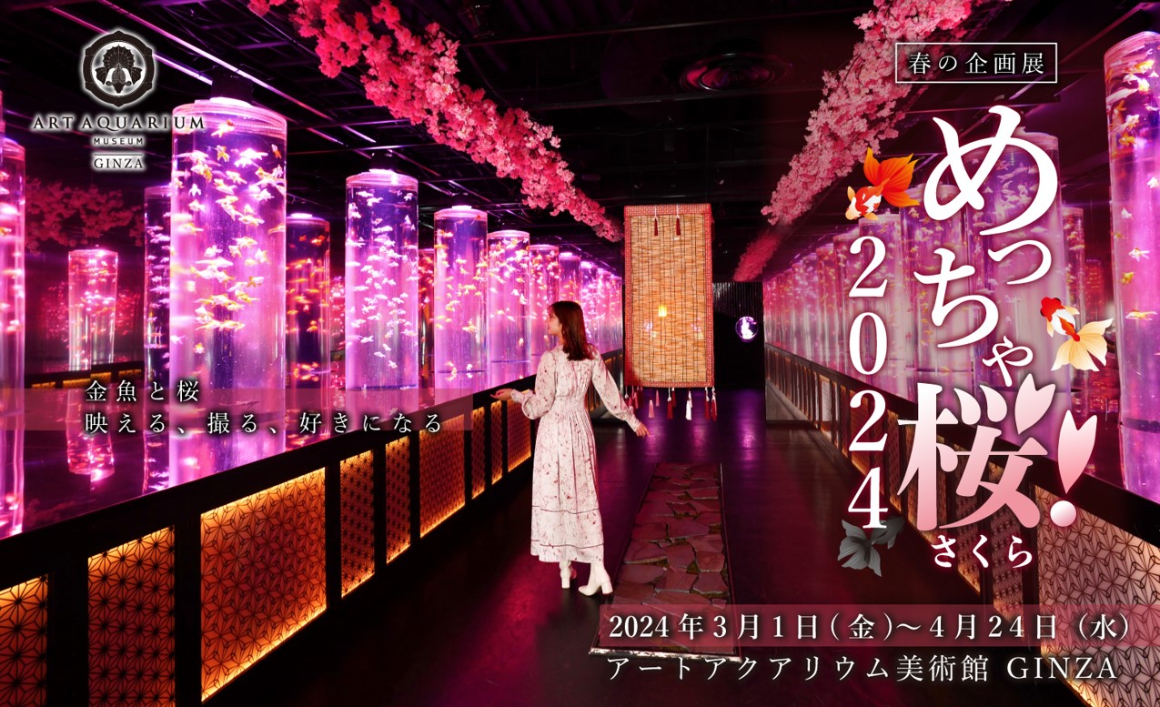 現在、春の企画展「めっちゃ桜2024」を4月24日(水)までの期間限定で開催中です。日本の春を象徴する桜をモチーフにした様々な作品展示や空間演出を行い、春の装いで皆様をお迎えいたします。金魚が優美に泳ぐ水槽作品が並ぶ幻想世界が桜に染まる、まさに“めっちゃ桜”な空間をお楽しみください。