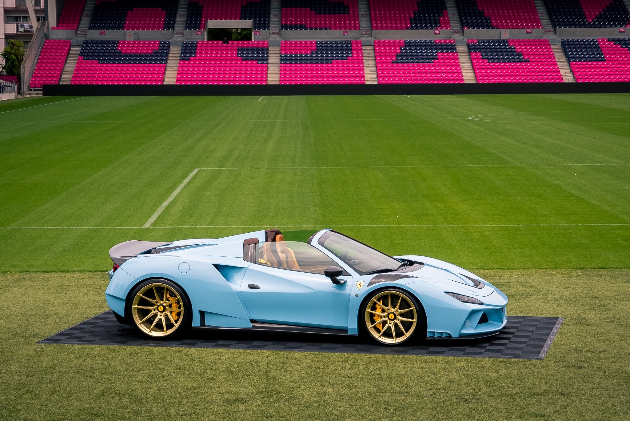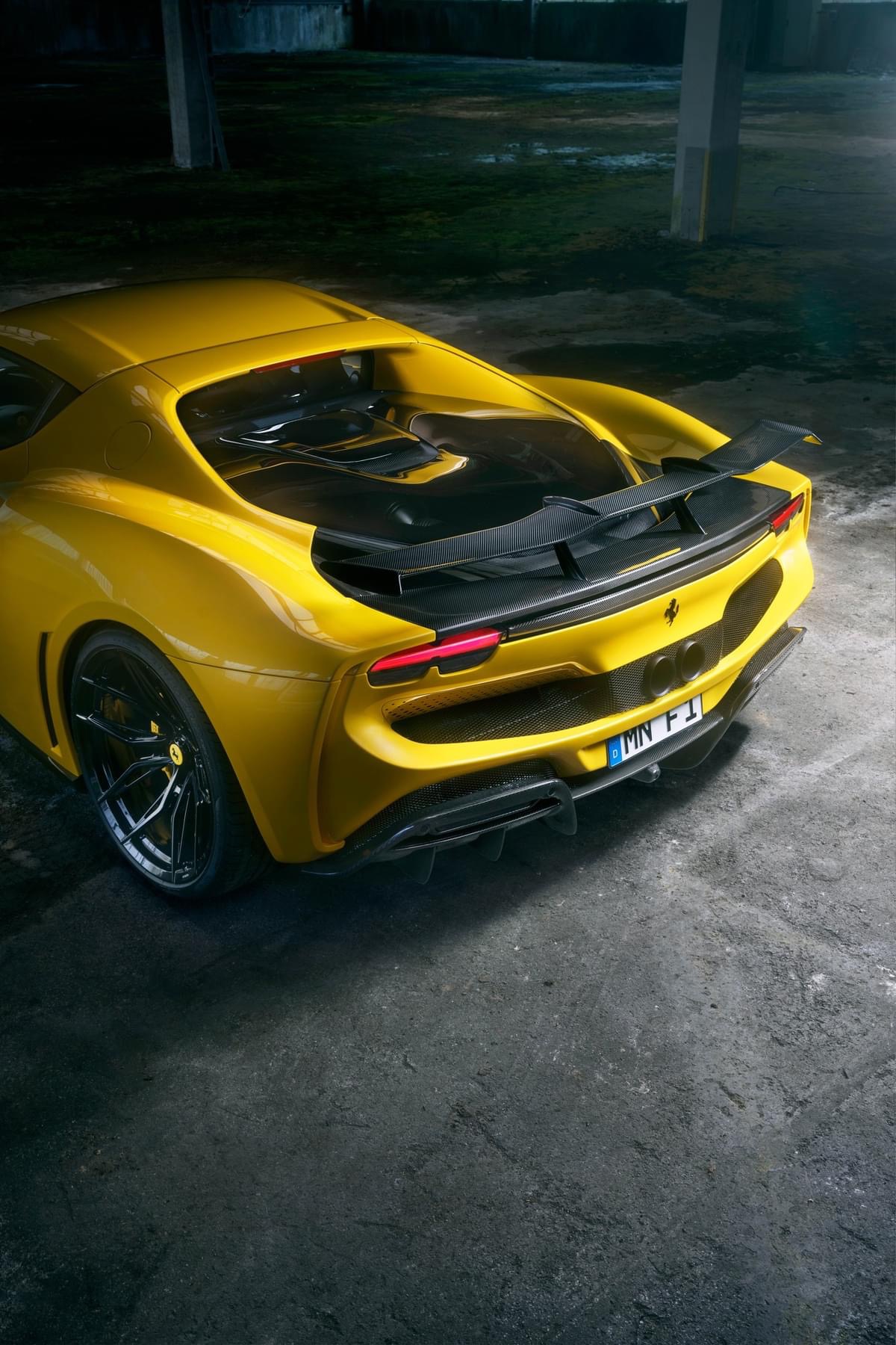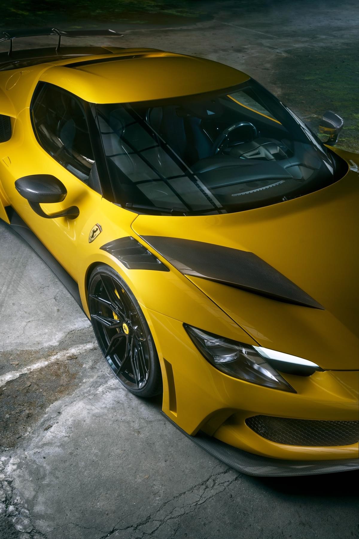 N-LARGOのボディはもちろん軽量かつ高強度なカーボン製であり、今回の296GTBにおいては、純正比で、フロント+6㎝、リア+12㎝というワイドボディ化を行いました。