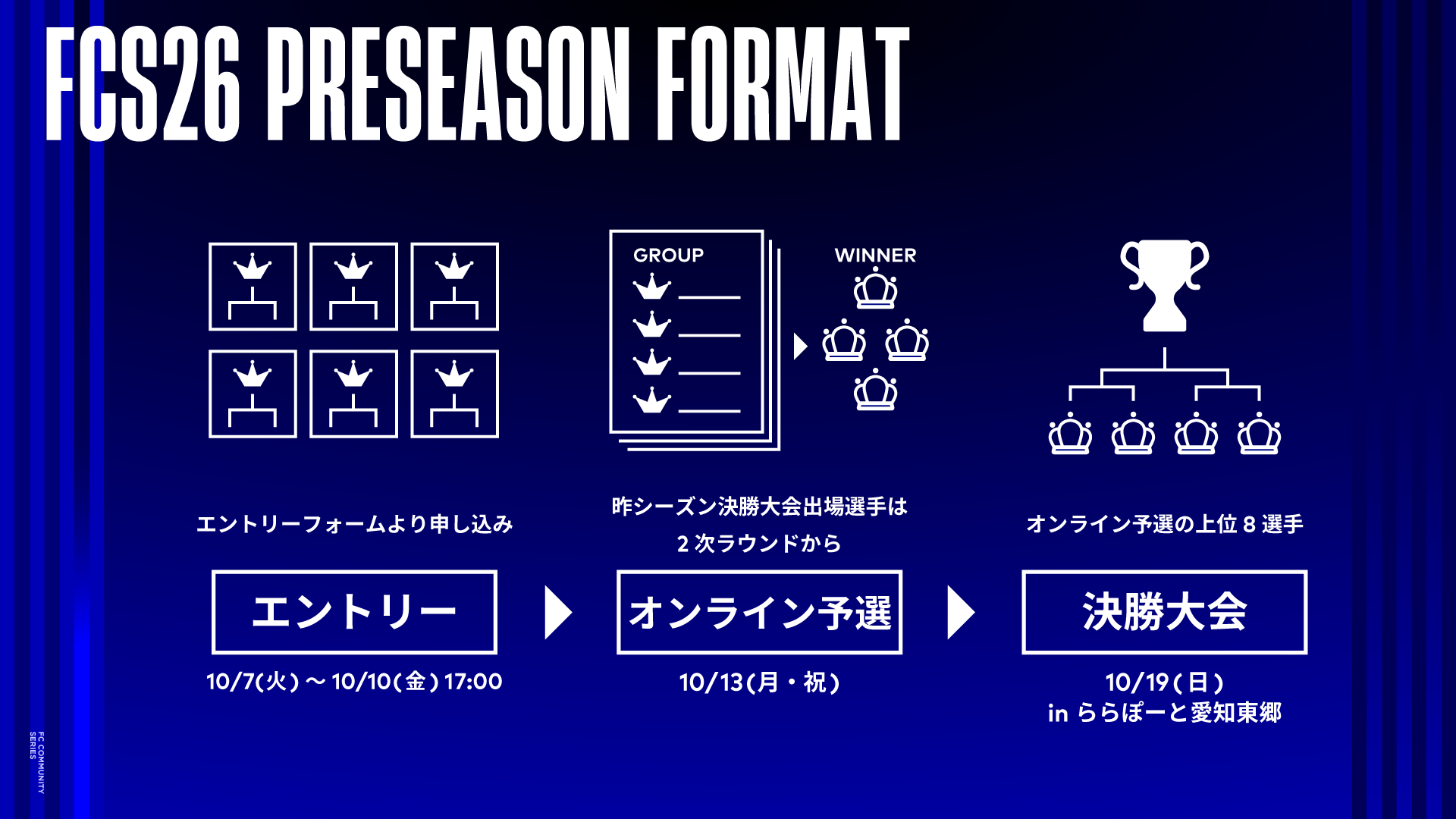 10月13日(月・祝)日中に開催する「FCS26 プレシーズン オンライン予選」は、1次ラウンド・2次ラウンド・決勝トーナメントの3部構成にて実施し、FCS25シーズンにて決勝大会に出場した経験のある選手(クラブフェスティバルを含み、計20選手程度が該当)は2次ラウンドからの参加となります。