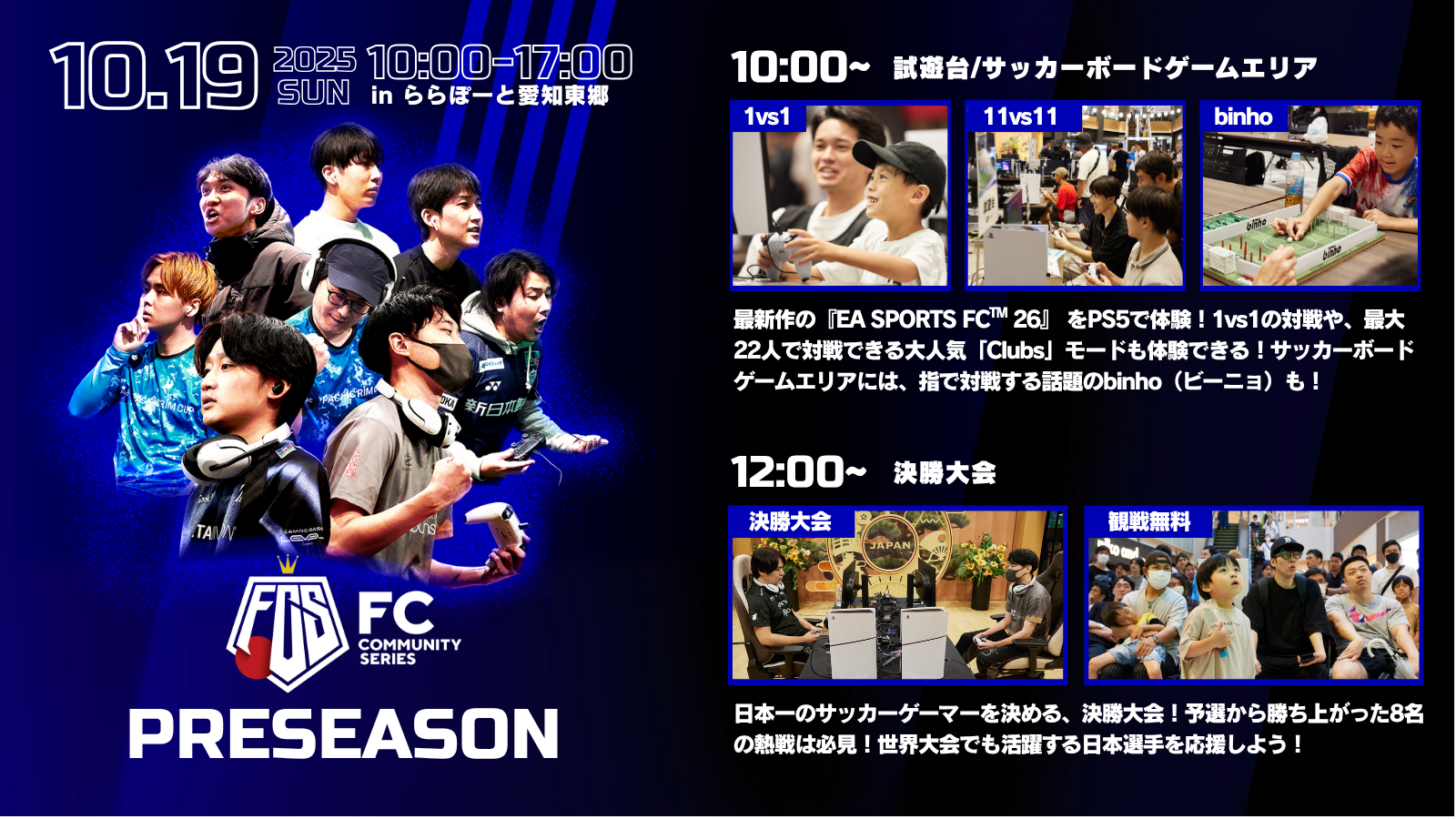 eスポーツ・サッカーゲーム大会『FCコミュニティシリーズ26 プレシーズン』開催決定!オープン参加のオンライン予選を10/13(月・祝)、決勝大会は10/19(日)にららぽーと愛知東郷にて中部初開催! プレスリリース