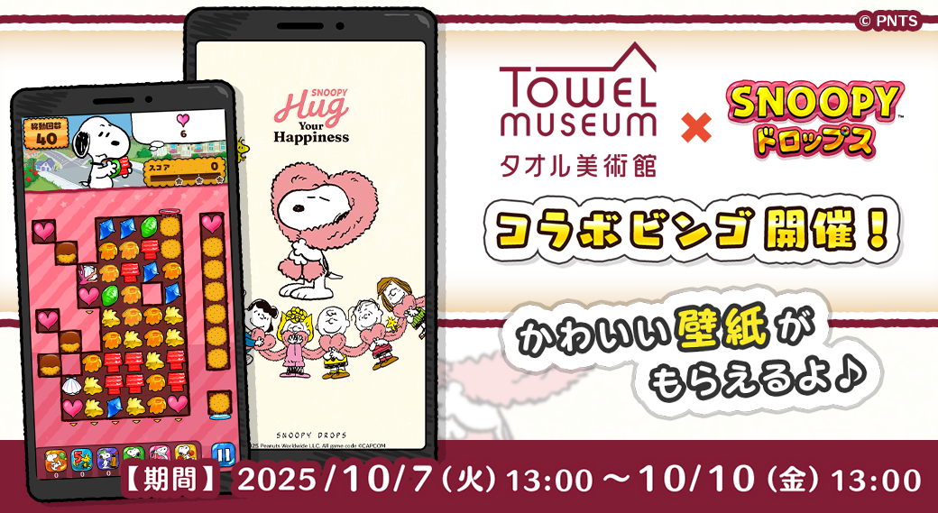 2025年10月4日(土)より開催の、タオル美術館「SNOOPY Hug Your Happiness ~スヌーピー しあわせつむぐ展~」限定アートがゲームに登場。
