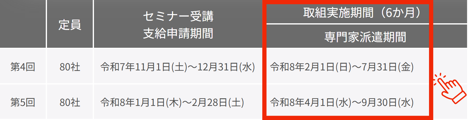 例えば、4月の人事異動で女性管理職を積極的に登用する場合、第4回もしくは第5回申請期間での申し込みが必要です。定員はいずれも先着80社となりますので、早めの申請をおすすめします。