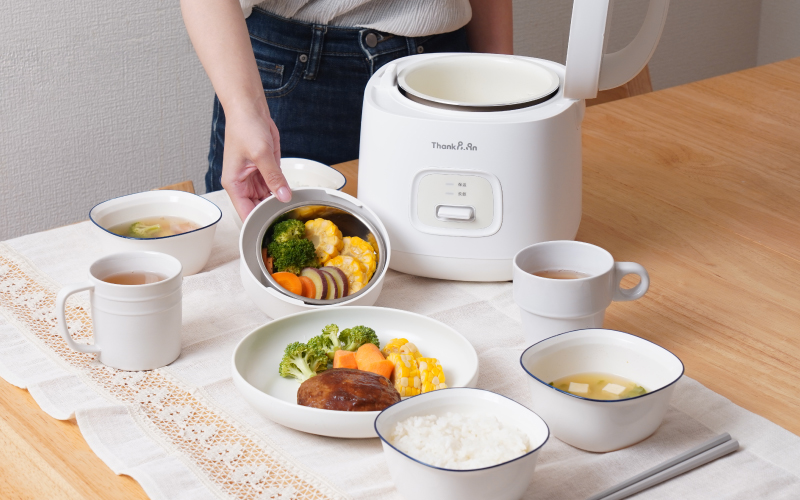 さらに付属の蒸しトレイを使えば、ご飯(1〜2合)を炊きながら、上段で温野菜などの蒸し料理を同時に作ることができます。