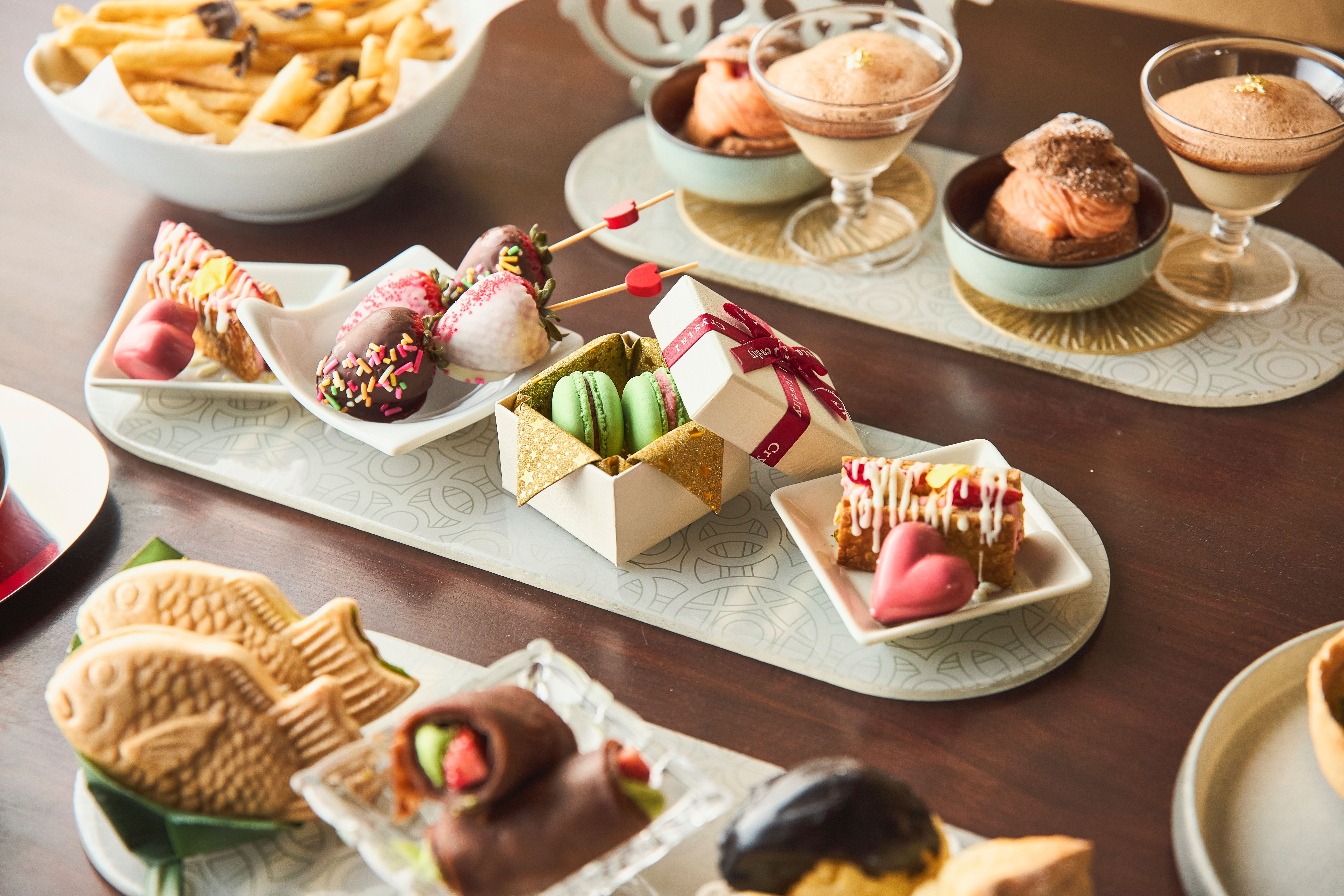 旬の甘酸っぱいいちごに、とろけるショコラをまとわせた「フレッシュ苺のショコラコーティング」、プレゼントボックスに詰め込んだ「抹茶と苺のマカロン」はバレンタインの雰囲気たっぷり。