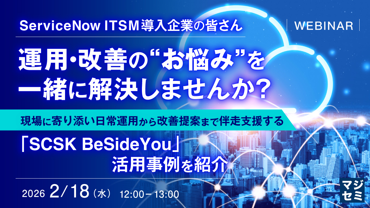 ServiceNow ITSM導入後、運用負荷の増大や改善開発の停滞などに悩む企業は少なくありません。本セミナーでは、そうした“導入後の壁”を解消するための実践ノウハウを紹介します。ServiceNow導入後にありがちな課題を整理するとともに、その課題解決策として、SCSKが提供するServiceNow保守運用活用支援サービス「SCSK BeSideYou」をご紹介。現場に寄り添いながら、運用効率化のための改善提案を一貫して支援。さらに、実際にServiceNow ITSMの運用課題に対する支援事例をもとに、具体的な進め方と成果を解説します。「技術面だけでなく、現場の課題に寄り添って一緒に考えてくれる存在が欲しい」「気軽に相談できるサポート先がない」とお悩みの方は、ぜひ本セミナーで“伴走型支援”による運用改善のヒントをご確認ください。