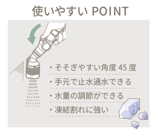 さらに、快適な散水ができるように、ヘッドは大きく動かさなくても手元から遠くまで水がまける45°の角度をつけています。