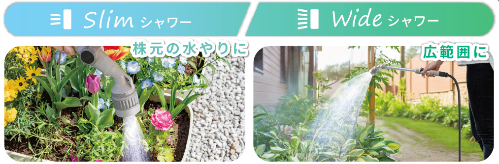 植物の種類や生育状態など、用途や状況に合わせてスムーズに水やりができるように、ヘッド部分は回すだけで「ワイド」と「スリム」の2種類のシャワーに切り替えられます。