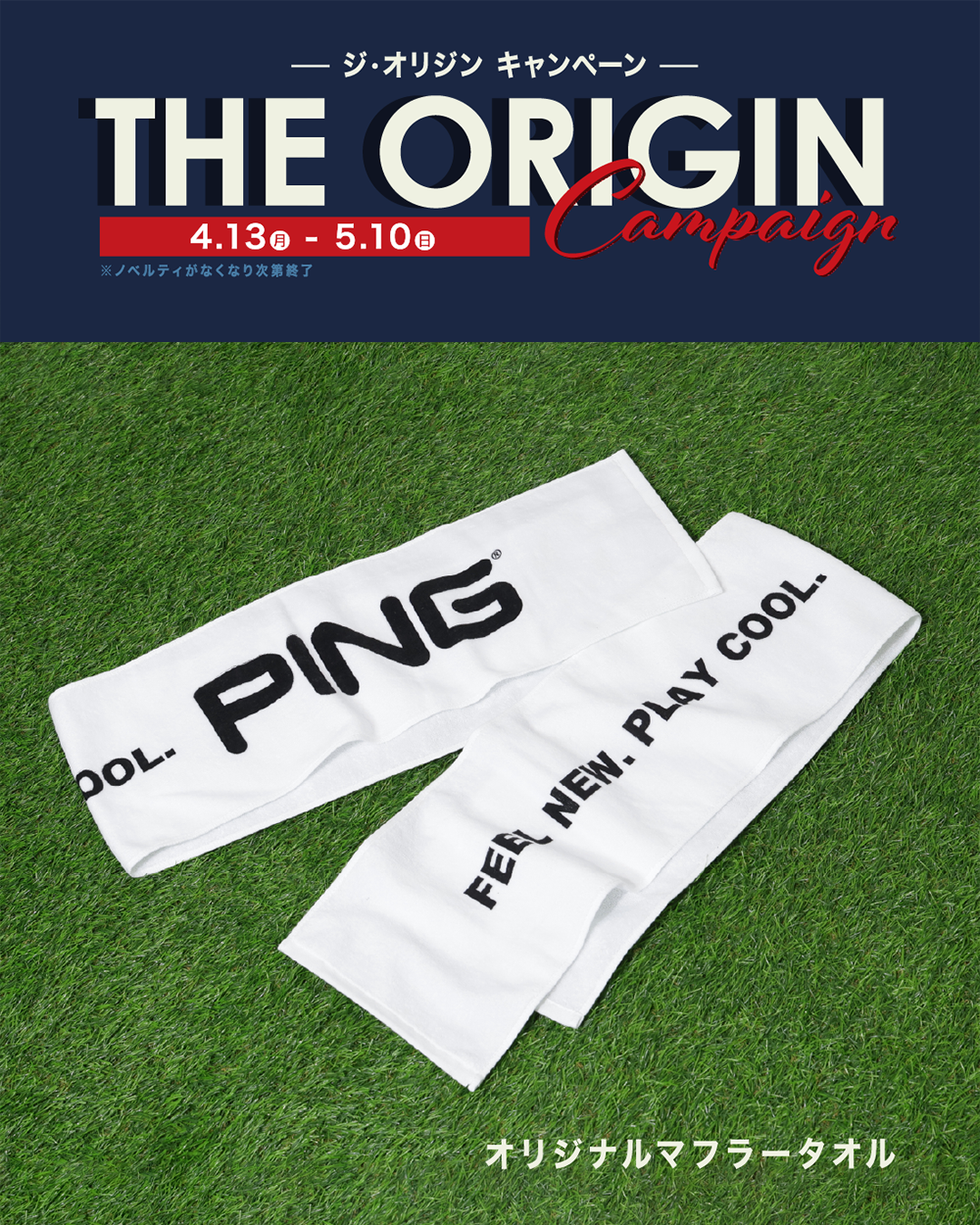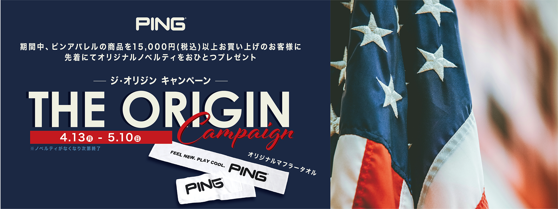 15,000円(税込)以上お買い上げのお客様に先着にてPINGロゴ入りオリジナルマフラータオルをお1つプレゼントいたします。