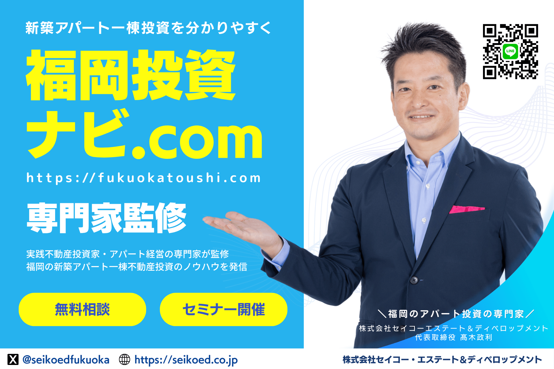 福岡投資ナビhttps://fukuokatoushi.com/)は、これから福岡で新築アパート一棟投資に挑戦したい方、アパート経営を通じて長期的な資産形成を目指す方に向けて、土地探しから融資戦略、間取り設計、施工、管理運用、売却までを包括的に解説。全ての記事を、不動産投資初心者でも安心して読み進められるよう構成しています。