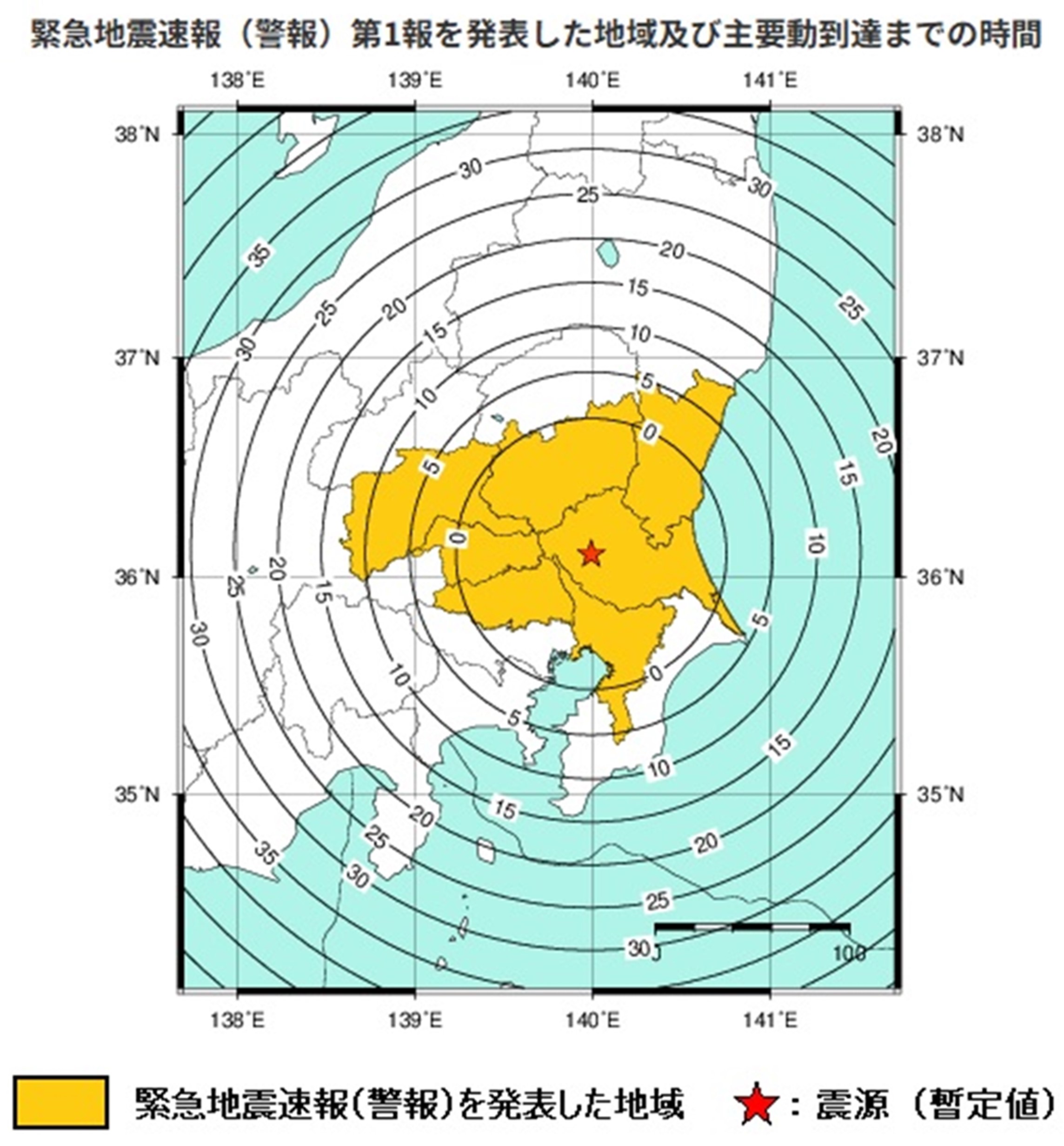 図6 2026年4月1日茨城県南部地震の緊急地震速報(警報)発表地域及び主要動到達までの時間                    (出典:気象庁ホームページ2026年4月1日)