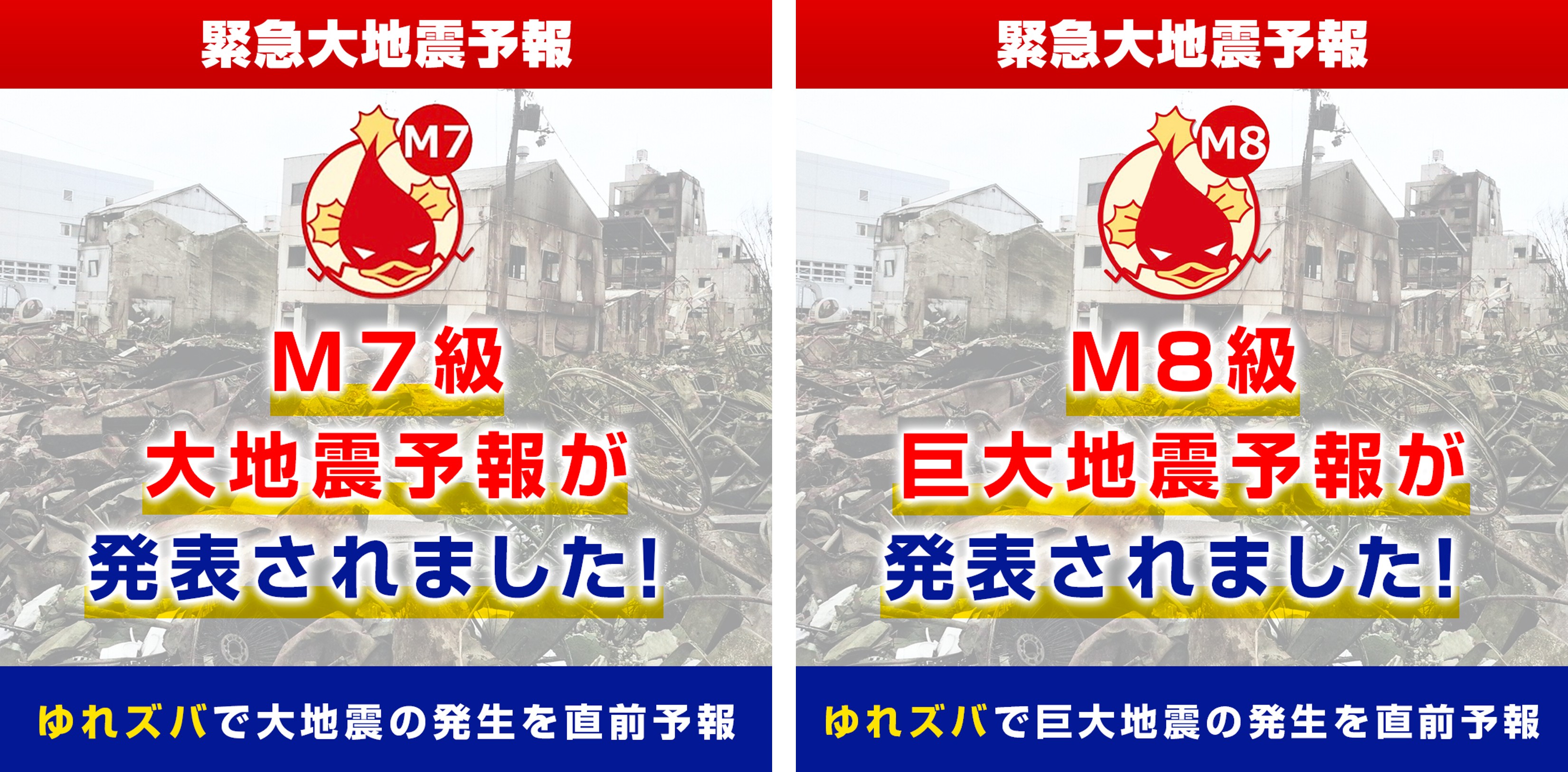 図2 緊急大地震予報画像(サンプル画像・左図:M7級大地震予報、右図:M8級巨大地震予報)