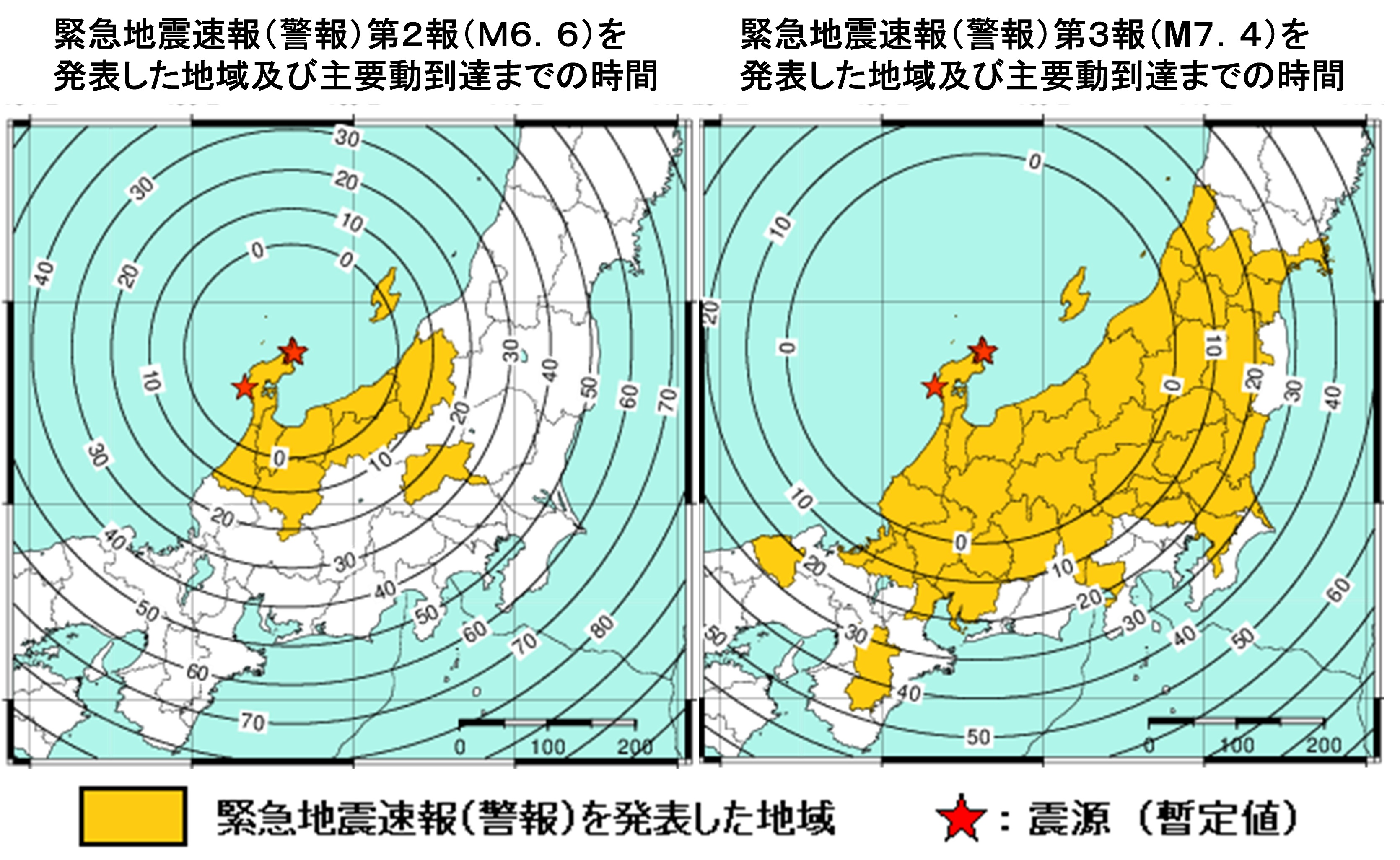 なおこの際に気象庁発表の緊急地震速報(警報第2報)は、揺れが強かった震源域周辺の直径約430kmの領域で、速報が主要動の到達に間に合いませんでした(図5左図の0秒円内)。