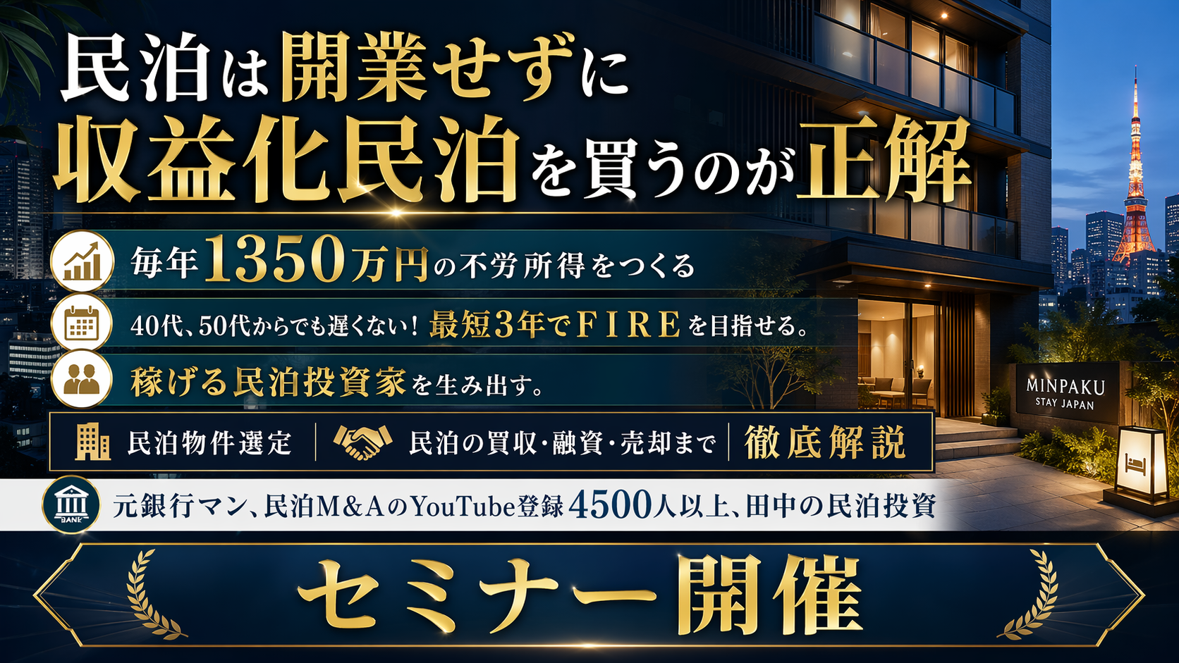 4/25(土)民泊の正しい始め方セミナー。民泊でFIRE!年間1,350万円を目指す!節税効果アリ。民泊投資家を多数輩出中『稼げる民泊YouTube』登録者4,000人以上の元銀行マンが伝える